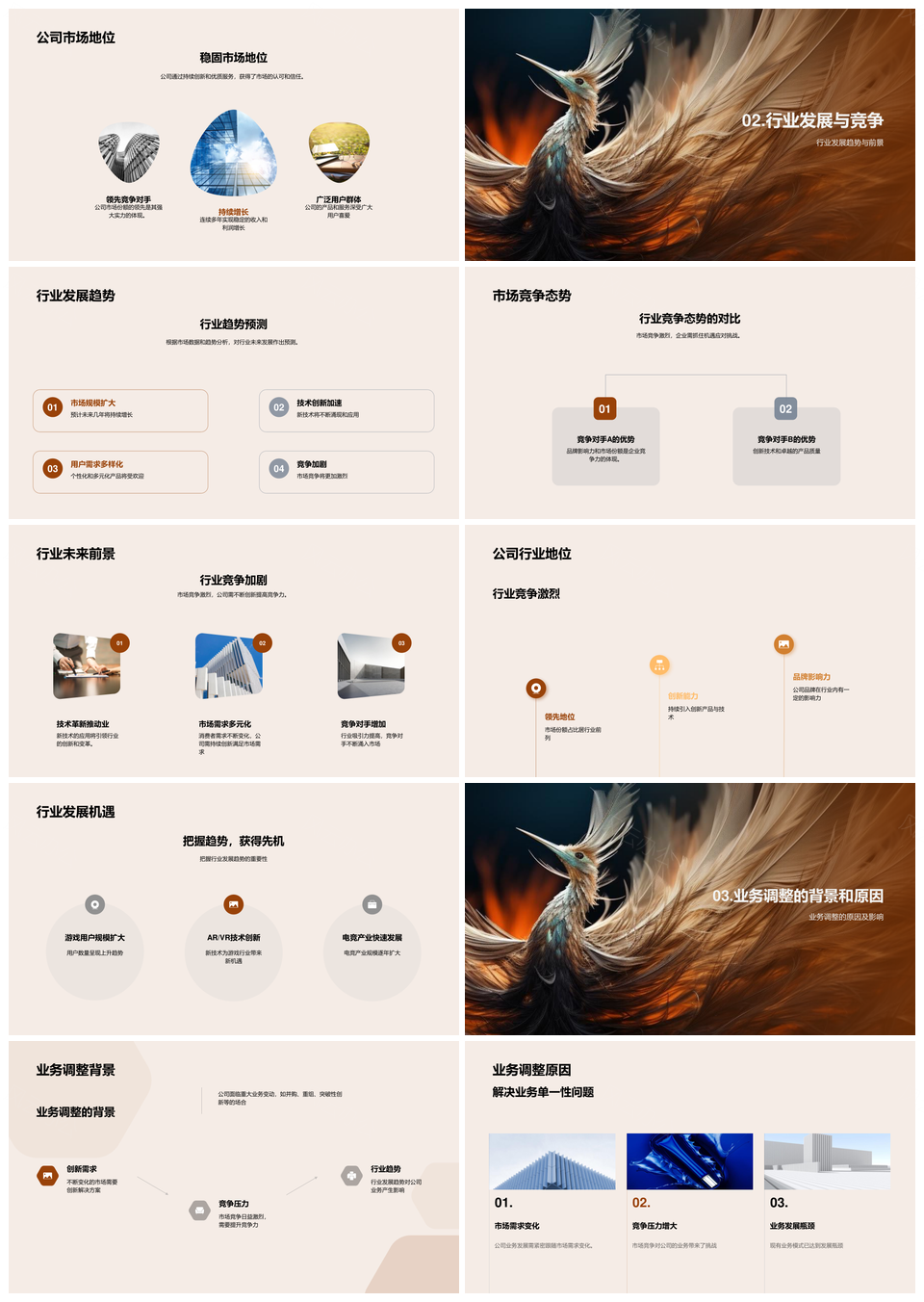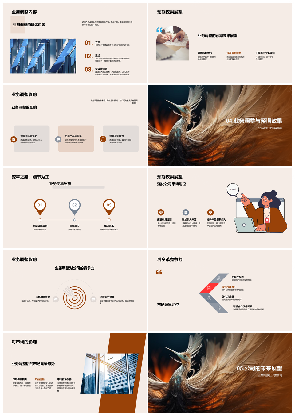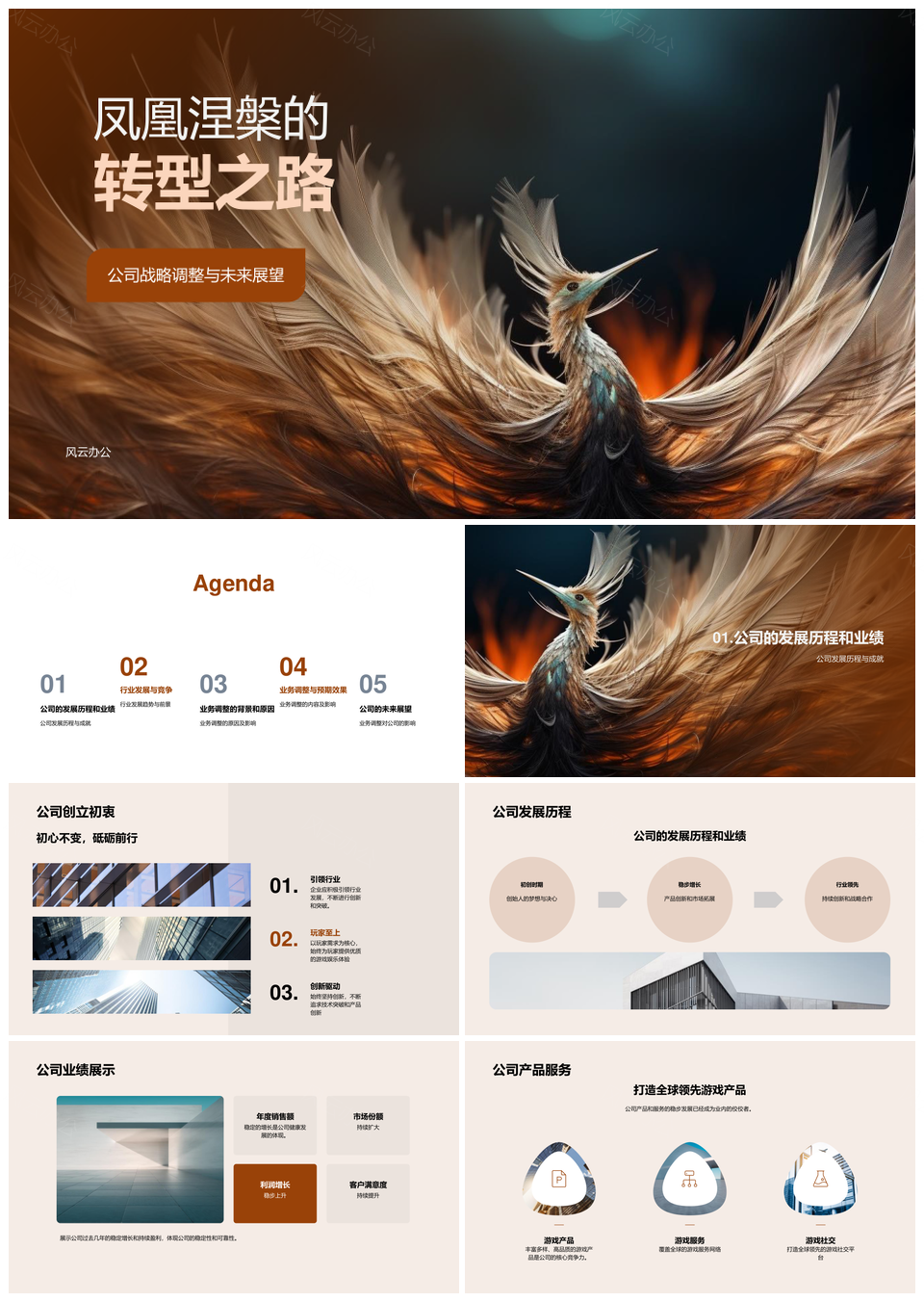 风云办公提供的凤凰涅槃战略并购重组创新转型PPT模板,下载格式为pptx,一共33页,作品中文字及图均可以修改和编辑,图片更改请在作品中右键图片并更换,文字修改请直接点击文字进行修改。