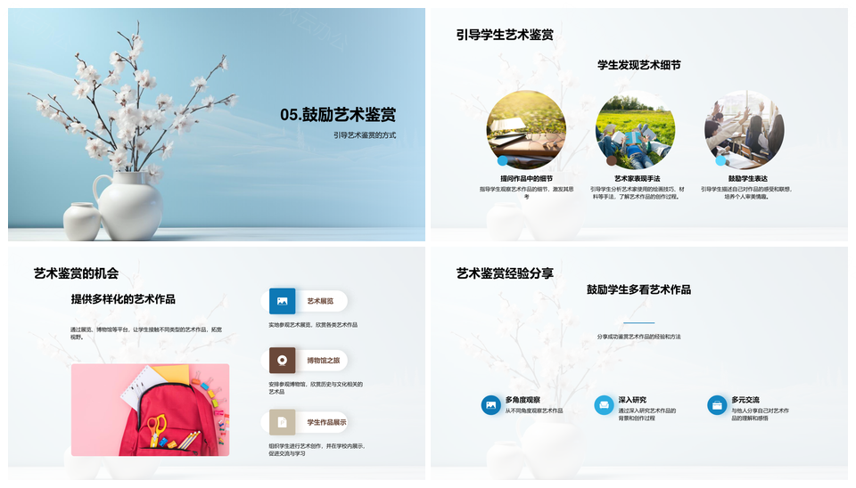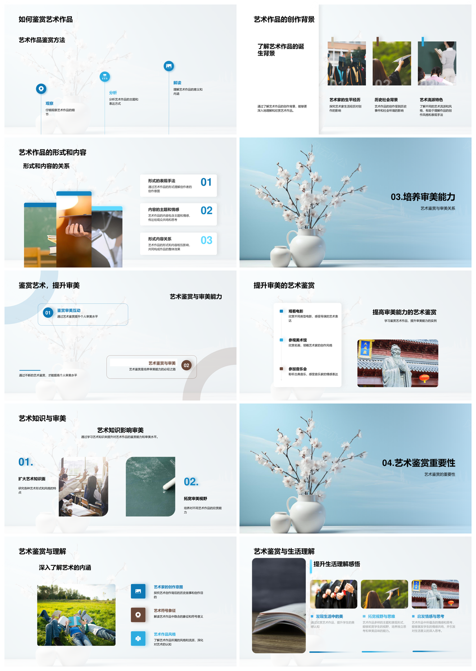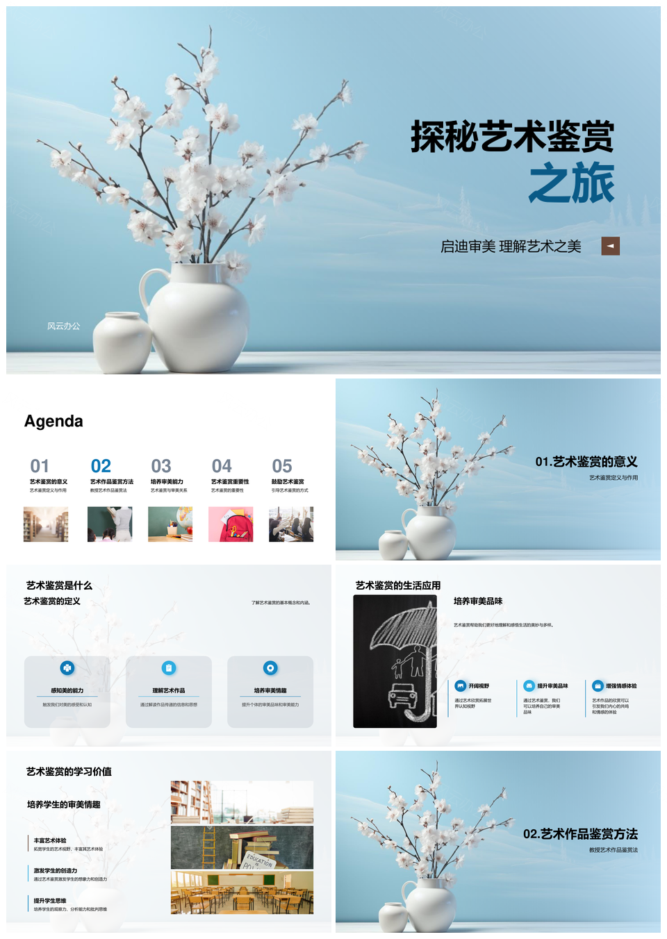 风云办公提供的初中艺术鉴赏课堂探索细节审美提升PPT模板,下载格式为pptx,一共22页,作品中文字及图均可以修改和编辑,图片更改请在作品中右键图片并更换,文字修改请直接点击文字进行修改。