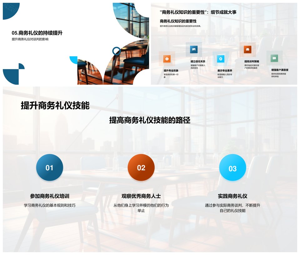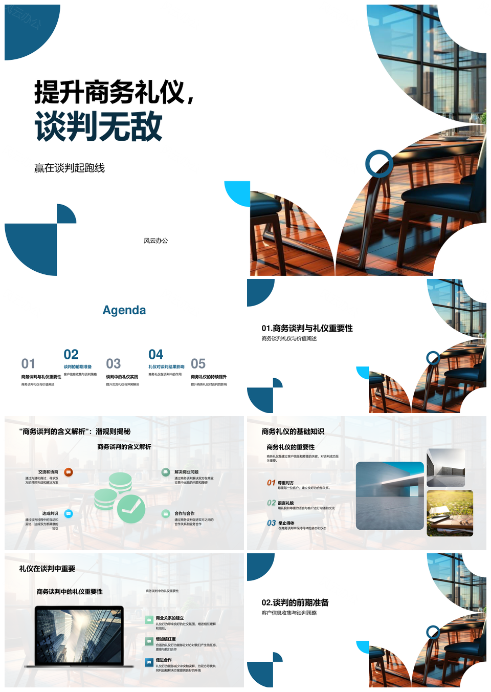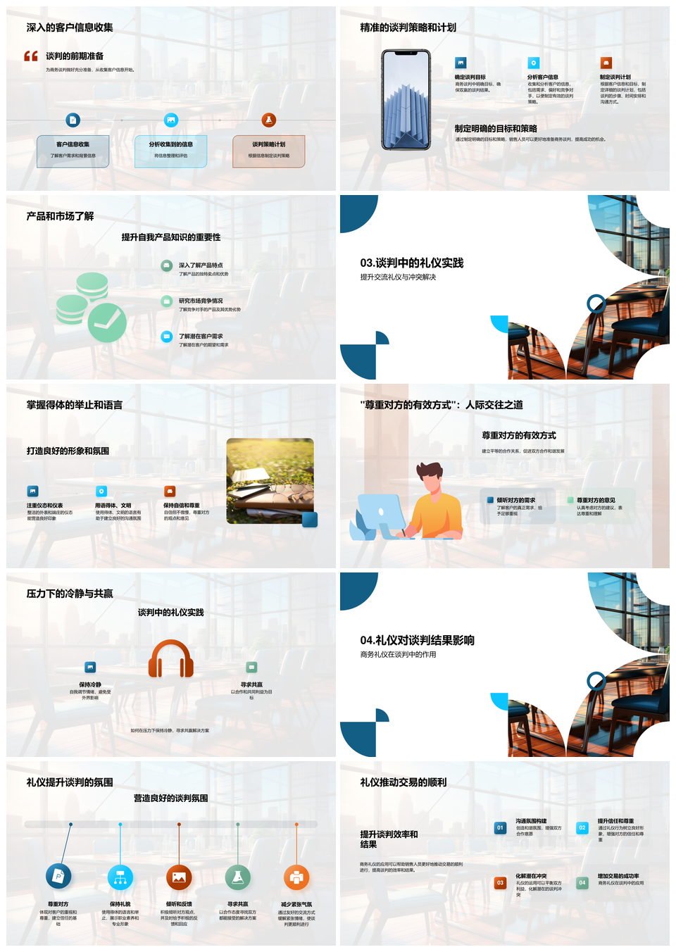 风云办公提供的销售人员商务礼仪与谈判策略提升PPT模板,下载格式为pptx,一共21页,作品中文字及图均可以修改和编辑,图片更改请在作品中右键图片并更换,文字修改请直接点击文字进行修改。