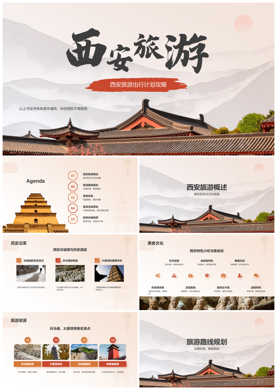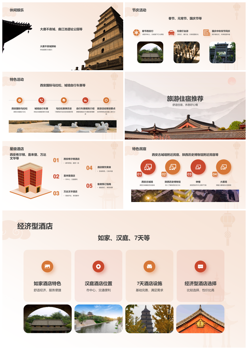 西安美食文化历史遗迹视觉味蕾一站式品质旅游攻略PPT模板推荐