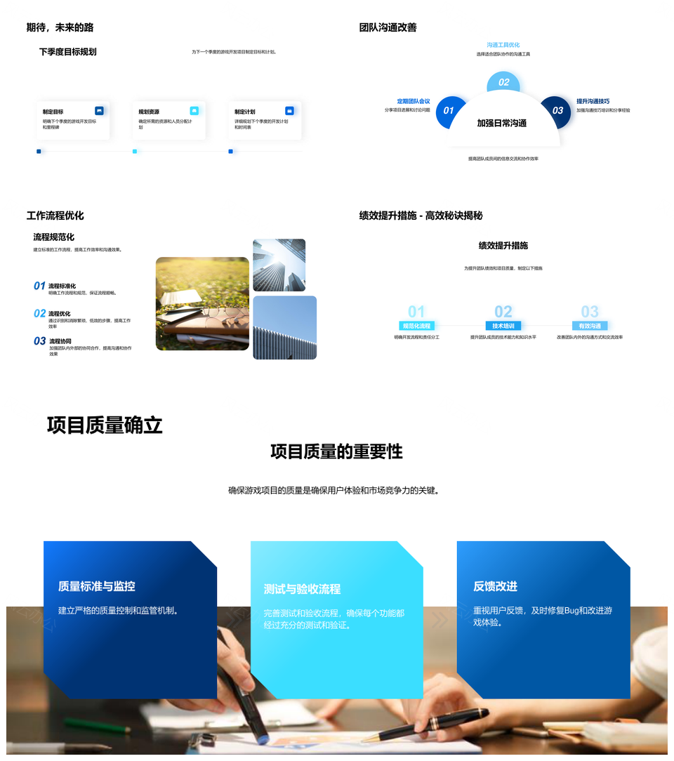 这是一张游戏开发团队成长项目进阶季度关键里程碑PPT模板,包含游戏、开发团队、成长项目、进阶、季度、关键、里程碑等主题内容,也可用作游戏开发团队成长项目、开发团队成长项目进阶、团队成长项目进阶季度、成长项目进阶季度关键、项目进阶季度关键里程碑、游戏开发团队成长、开发团队成长项目、团队成长项目进阶、成长项目进阶季度、项目进阶季度关键、季度关键里程碑、游戏开发团队、开发团队成长、团队成长项目、成长项目进阶等PPT场景使用。 风云办公提供的游戏开发团队成长项目进阶季度关键里程碑PPT模板,下载格式为pptx,一共33页,作品中文字及图均可以修改和编辑,图片更改请在作品中右键图片并更换,文字修改请直接点击文字进行修改。