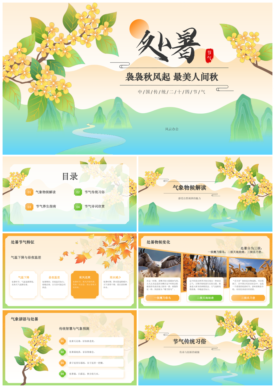这是一张2025处暑二十四节气秋季气象健康作息习俗科普PPT模板,包含2025、处暑、二十四节气、秋季、气象、健康、作息、习俗、科普等主题内容,也可用作2025处暑二十四节气秋季气象、处暑二十四节气秋季气象健康、二十四节气秋季气象健康作息、秋季气象健康作息习俗、气象健康作息习俗科普、2025处暑二十四节气秋季、处暑二十四节气秋季气象、二十四节气秋季气象健康、秋季气象健康作息、气象健康作息习俗、健康作息习俗科普、2025处暑二十四节气、处暑二十四节气秋季、二十四节气秋季气象、秋季气象健康作息等PPT场景使用。 风云办公提供的2025处暑二十四节气秋季气象健康作息习俗科普PPT模板,下载格式为pptx,一共19页,作品中文字及图均可以修改和编辑,图片更改请在作品中右键图片并更换,文字修改请直接点击文字进行修改。