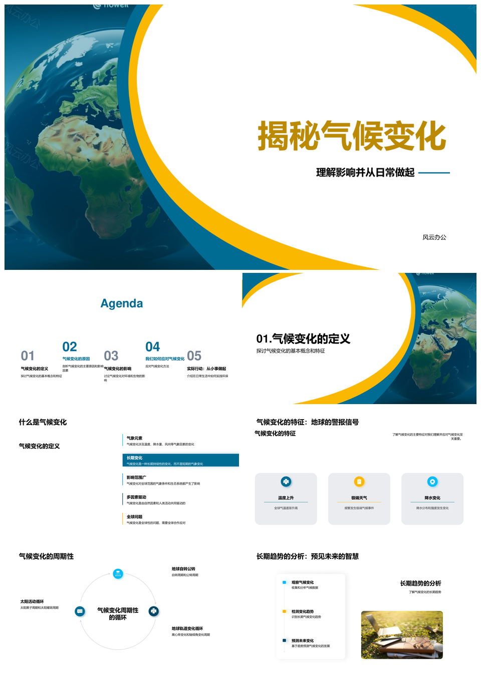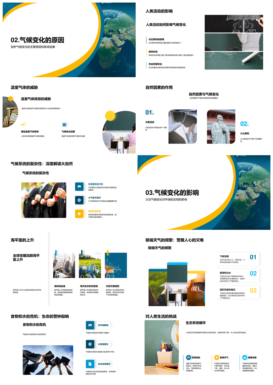 这是一张气候变化人类活动自然因素致海平面极端天气食物水危机保护地球PPT模板,包含气候变化、人类活动、自然因素、海平面、极端天气、食物、水危机、保护地球等主题内容,也可用作气候变化人类活动自然因素海平面、人类活动自然因素海平面极端天气、自然因素海平面极端天气食物水危机、海平面极端天气食物水危机保护地球、气候变化自然因素极端天气、自然因素极端天气食物水危机保护地球、极端天气食物水危机保护地球气候变化、气候变化人类活动海平面、人类活动海平面极端天气、海平面极端天气食物水危机、极端天气食物水危机保护地球、气候变化自然因素海平面、自然因素海平面极端天气、气候变化极端天气海平面、人类活动自然因素极端天气等PPT场景使用。 风云办公提供的气候变化人类活动自然因素致海平面极端天气食物水危机保护地球PPT模板,下载格式为pptx,一共28页,作品中文字及图均可以修改和编辑,图片更改请在作品中右键图片并更换,文字修改请直接点击文字进行修改。