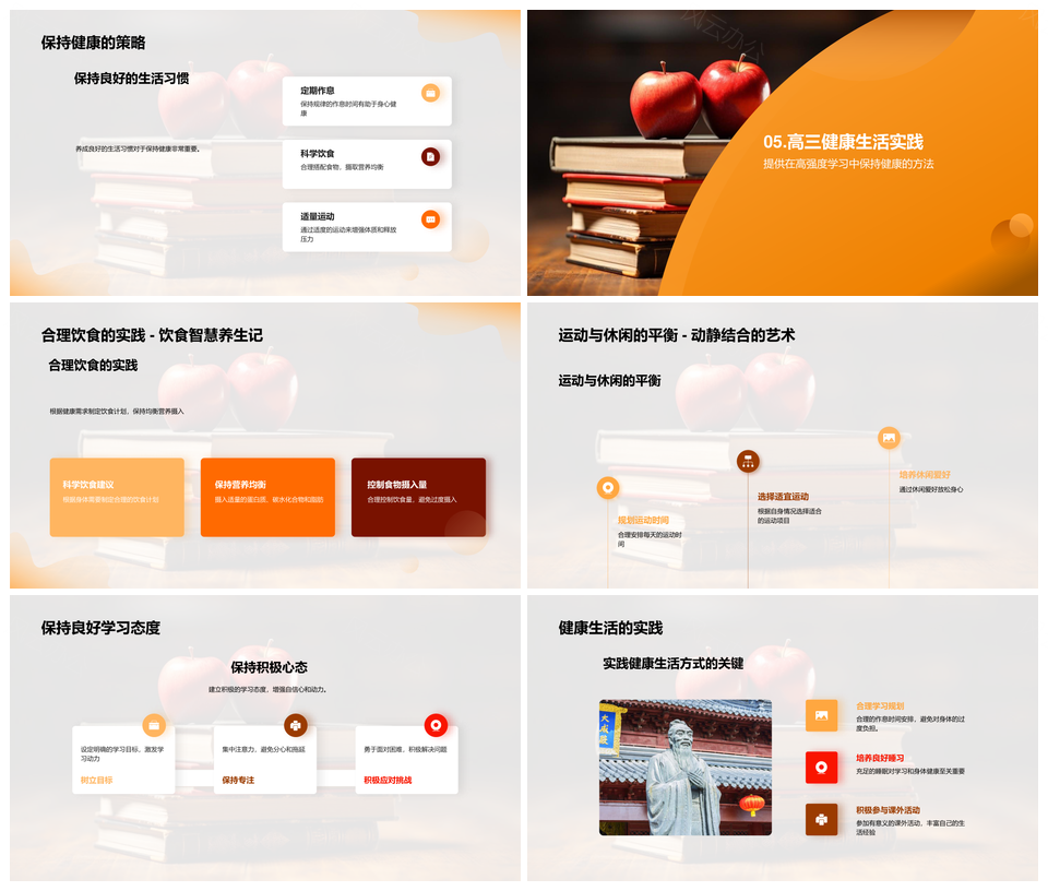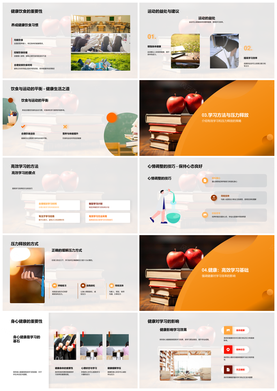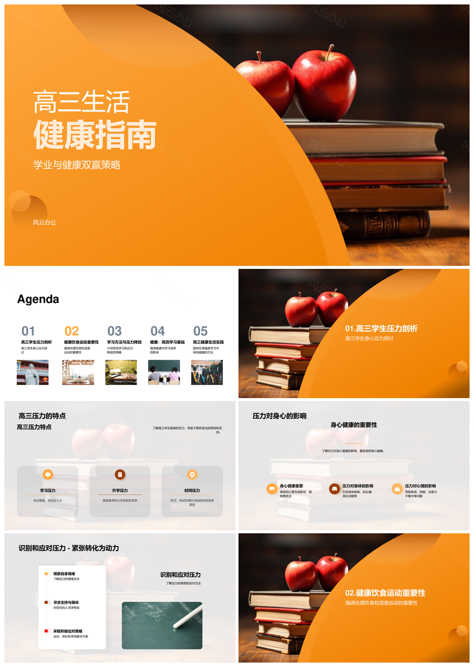 风云办公提供的高三健康饮食运动高效学习书堆指南PPT模板,下载格式为pptx,一共24页,作品中文字及图均可以修改和编辑,图片更改请在作品中右键图片并更换,文字修改请直接点击文字进行修改。