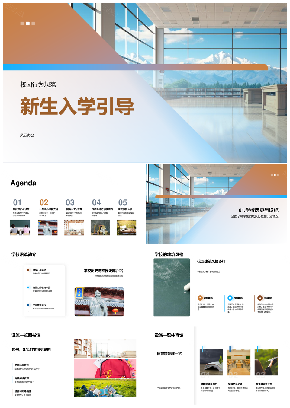 风云办公提供的新生入学指引校史规范课程同学生活PPT模板,下载格式为pptx,一共33页,作品中文字及图均可以修改和编辑,图片更改请在作品中右键图片并更换,文字修改请直接点击文字进行修改。