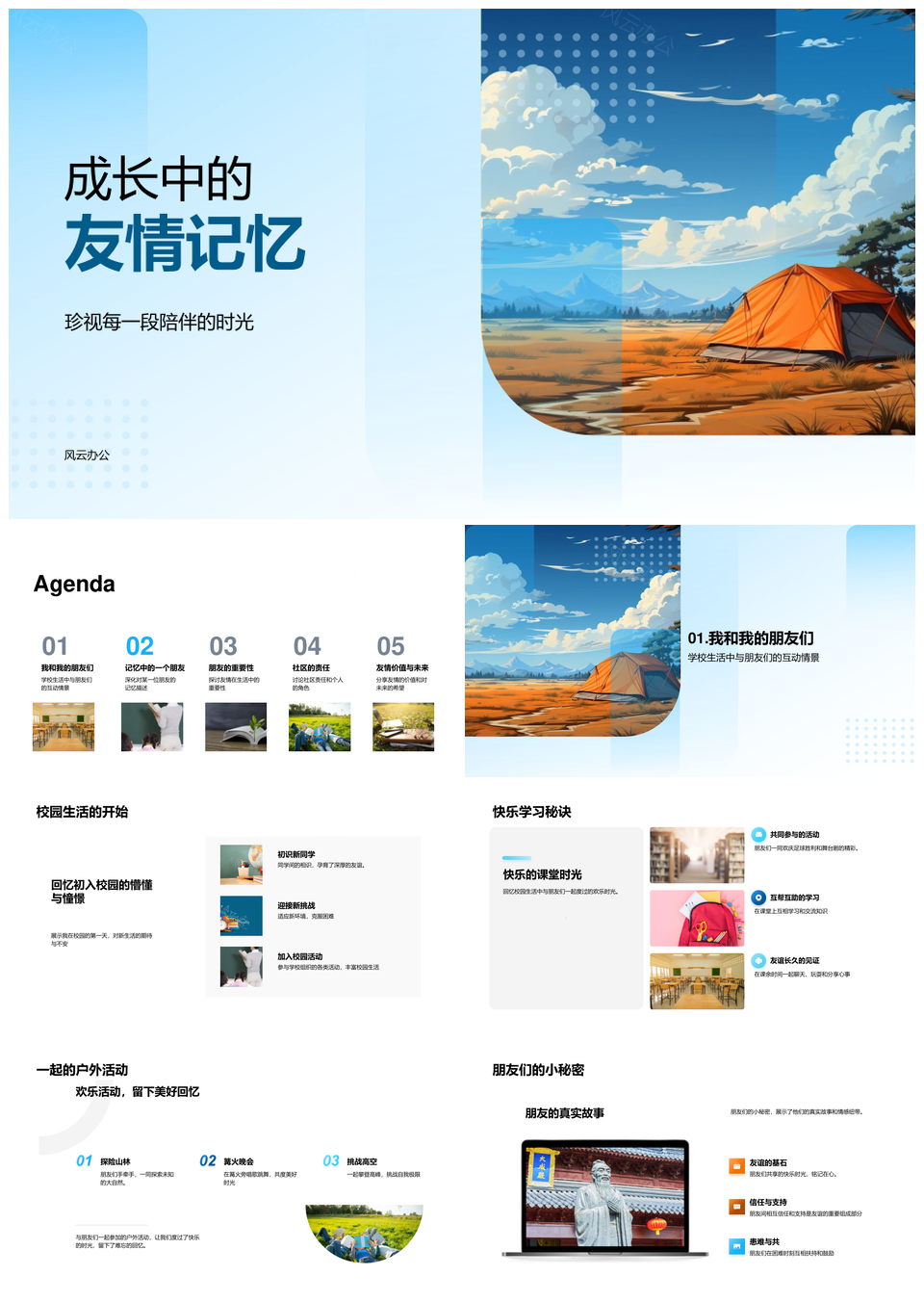 风云办公提供的家校露营同桌书启友情记忆共成长PPT模板,下载格式为pptx,一共30页,作品中文字及图均可以修改和编辑,图片更改请在作品中右键图片并更换,文字修改请直接点击文字进行修改。