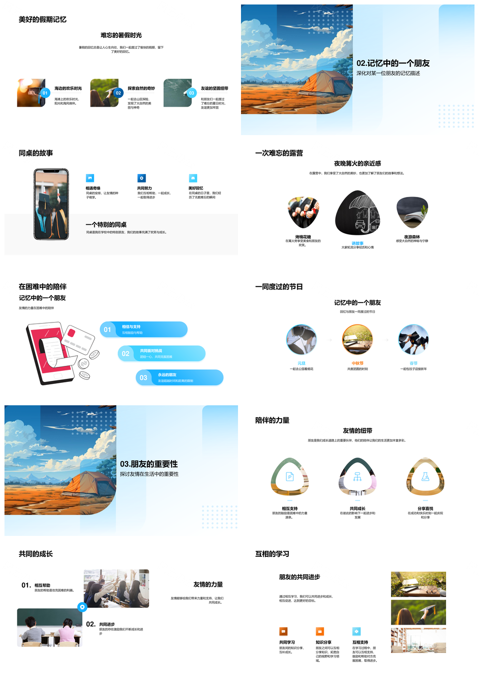 这是一张家校露营同桌书启友情记忆共成长PPT模板,包含家校、露营、同桌、书启、友情、记忆、共成长等主题内容,也可用作家校露营友情记忆、同桌书启友情记忆、书启友情记忆共成长、露营友情记忆共成长、家校露营记忆共成长、同桌友情记忆共成长、家校露营共成长、同桌书启友情、友情记忆共成长、书启记忆共成长、露营友情共成长、家校友情共成长、家校露营、同桌书启、友情记忆等PPT场景使用。