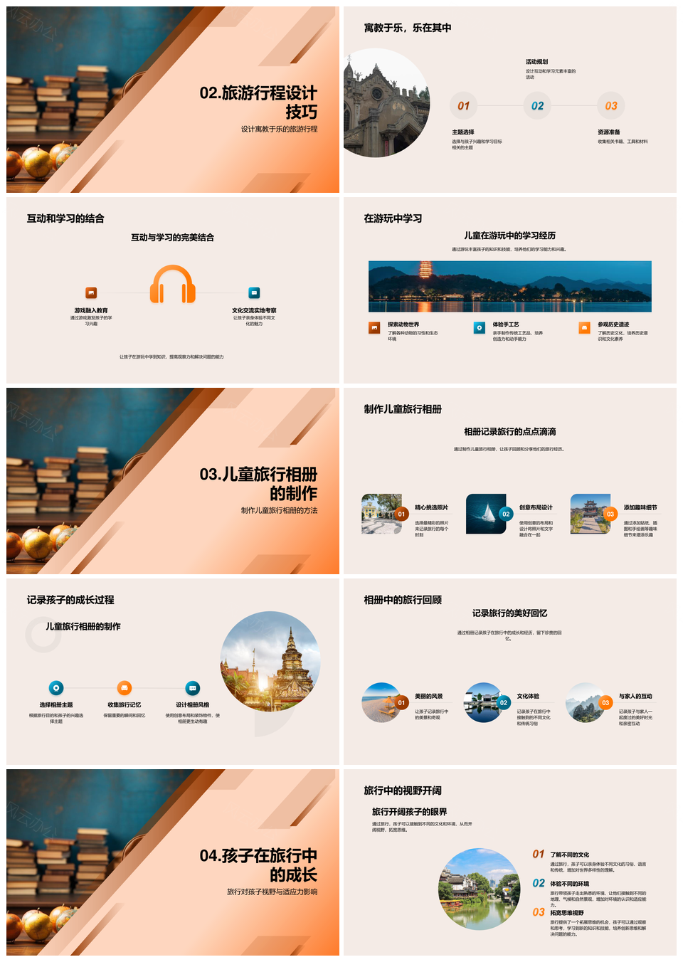 这是一张儿童游学寓教于乐旅行规划提升学习能力PPT模板,包含儿童、游学、寓教于乐、旅行规划、提升、学习能力等主题内容,也可用作儿童游学寓教于乐旅行规划、游学寓教于乐旅行规划提升、寓教于乐旅行规划提升学习能力、儿童游学旅行规划提升、儿童游学提升学习能力、游学旅行规划提升学习能力、儿童游学寓教于乐提升、游学寓教于乐提升学习能力、儿童游学旅行规划学习能力、儿童游学寓教于乐、游学寓教于乐旅行规划、寓教于乐旅行规划提升、旅行规划提升学习能力、儿童游学旅行规划、儿童游学提升等PPT场景使用。 风云办公提供的儿童游学寓教于乐旅行规划提升学习能力PPT模板,下载格式为pptx,一共24页,作品中文字及图均可以修改和编辑,图片更改请在作品中右键图片并更换,文字修改请直接点击文字进行修改。