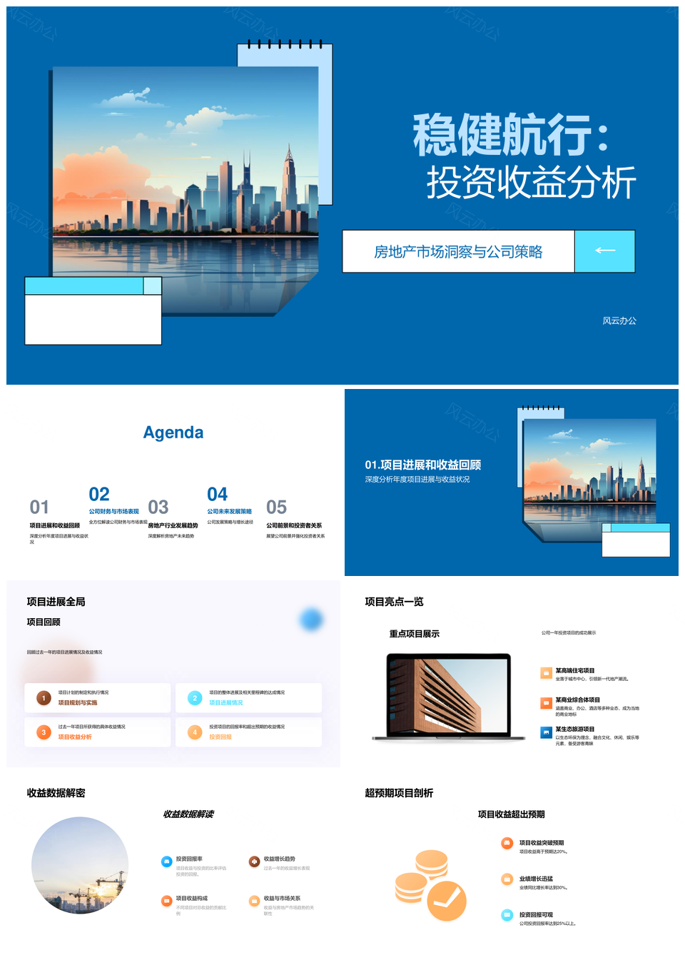 风云办公提供的稳健航行房地产投资策略项目收益分析PPT模板,下载格式为pptx,一共28页,作品中文字及图均可以修改和编辑,图片更改请在作品中右键图片并更换,文字修改请直接点击文字进行修改。