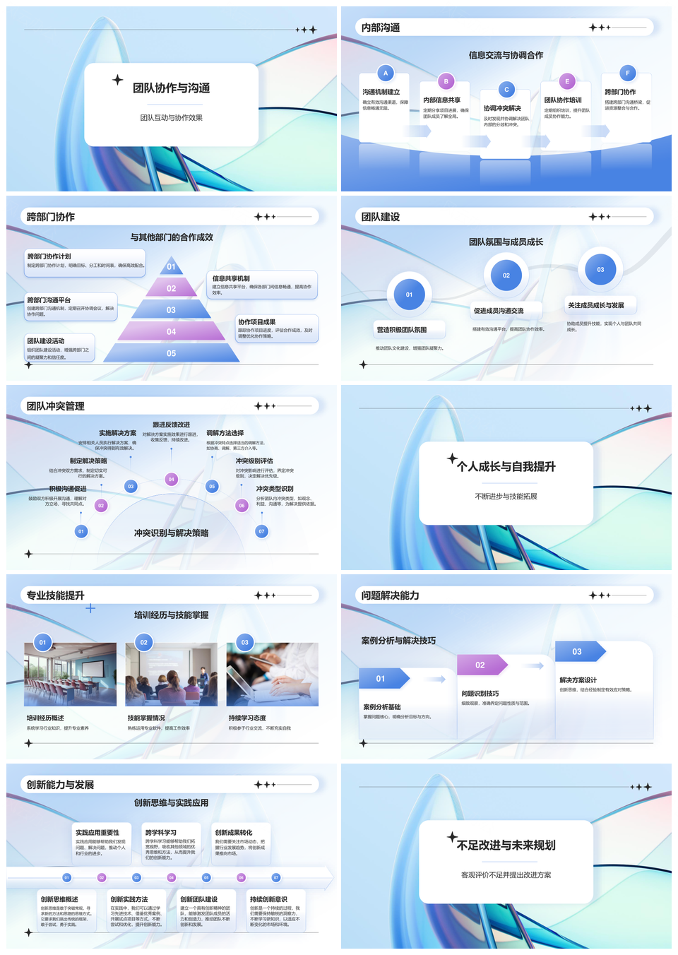 这是一张渐变风行业通用述职工作成果职责目标团队成长PPT模板,包含渐变风、行业、述职、工作成果、职责、目标、团队成长等主题内容,也可用作述职工作成果职责目标、工作成果职责目标团队成长、渐变风行业通用述职、述职工作成果职责、工作成果职责目标、职责目标团队成长、行业通用述职工作、通用述职工作成果、述职工作成果目标、工作成果目标团队、渐变风行业通用、行业通用述职、通用述职工作、述职工作成果、工作成果职责、职责目标、目标团队成长、述职工作目标、行业通用工作、通用职责目标等PPT场景使用。 风云办公提供的渐变风行业通用述职工作成果职责目标团队成长PPT模板,下载格式为pptx,一共21页,作品中文字及图均可以修改和编辑,图片更改请在作品中右键图片并更换,文字修改请直接点击文字进行修改。