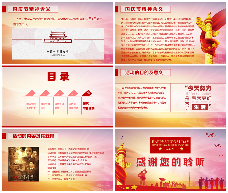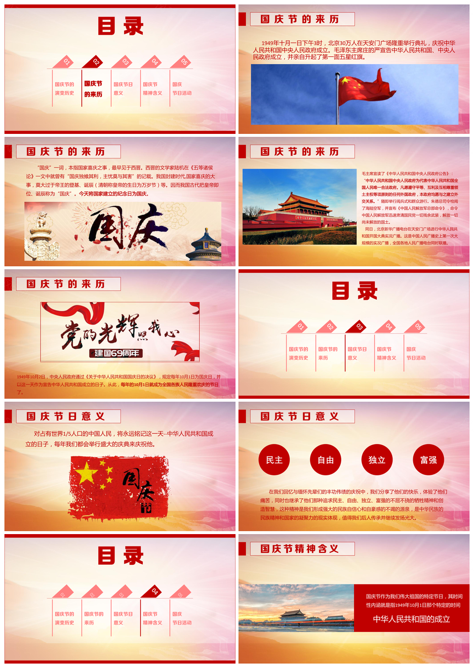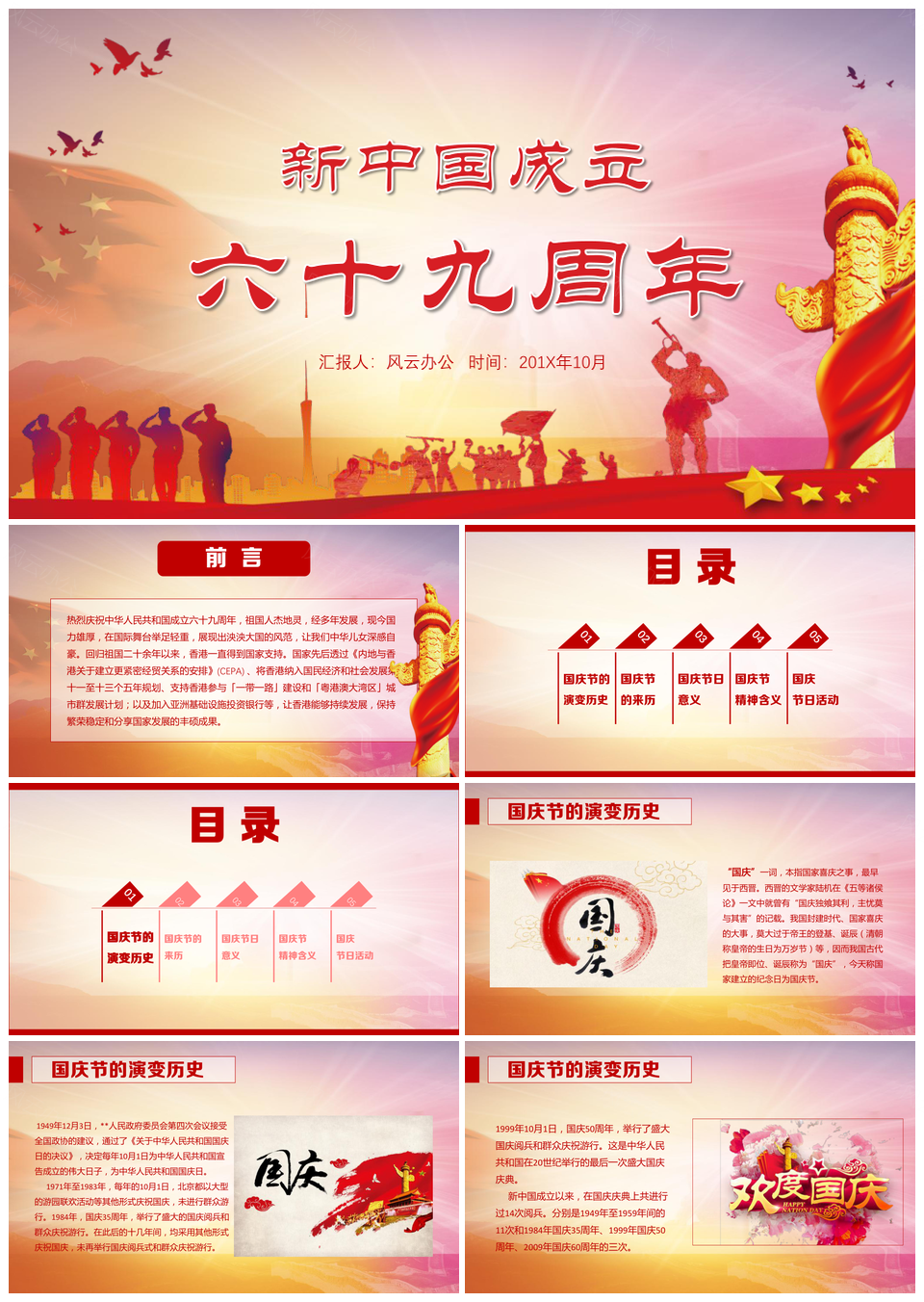 这是一张新中国成立六十九周年PPT模板,包含新中国成立、六十九周年等主题内容,也可用作新中国、成立、六十九、周年 新中国成立六十九周年、新中国六十九周年、成立六十九周年、新中国成立周年、新中国成立六十九、六十九周年、新中国成立、成立六十九、成立周年等PPT场景使用。 风云办公提供的新中国成立六十九周年PPT模板,下载格式为pptx,一共23页,作品中文字及图均可以修改和编辑,图片更改请在作品中右键图片并更换,文字修改请直接点击文字进行修改。