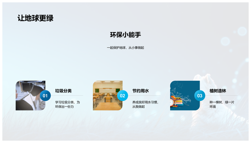 这是一张保护动物环保教育绿色出行共护地球生态平衡PPT模板,包含保护动物、环保教育、绿色出行、共护地球、生态平衡等主题内容,也可用作保护动物环保教育、环保教育绿色出行共护、绿色出行共护地球生态平衡、保护动物绿色出行共护、环保教育绿色出行、绿色出行共护地球、共护地球生态平衡、环保教育生态平衡、保护动物共护地球、保护动物、环保教育、绿色出行共护、共护地球、共护生态平衡、绿色出行生态平衡等PPT场景使用。 风云办公提供的保护动物环保教育绿色出行共护地球生态平衡PPT模板,下载格式为pptx,一共29页,作品中文字及图均可以修改和编辑,图片更改请在作品中右键图片并更换,文字修改请直接点击文字进行修改。