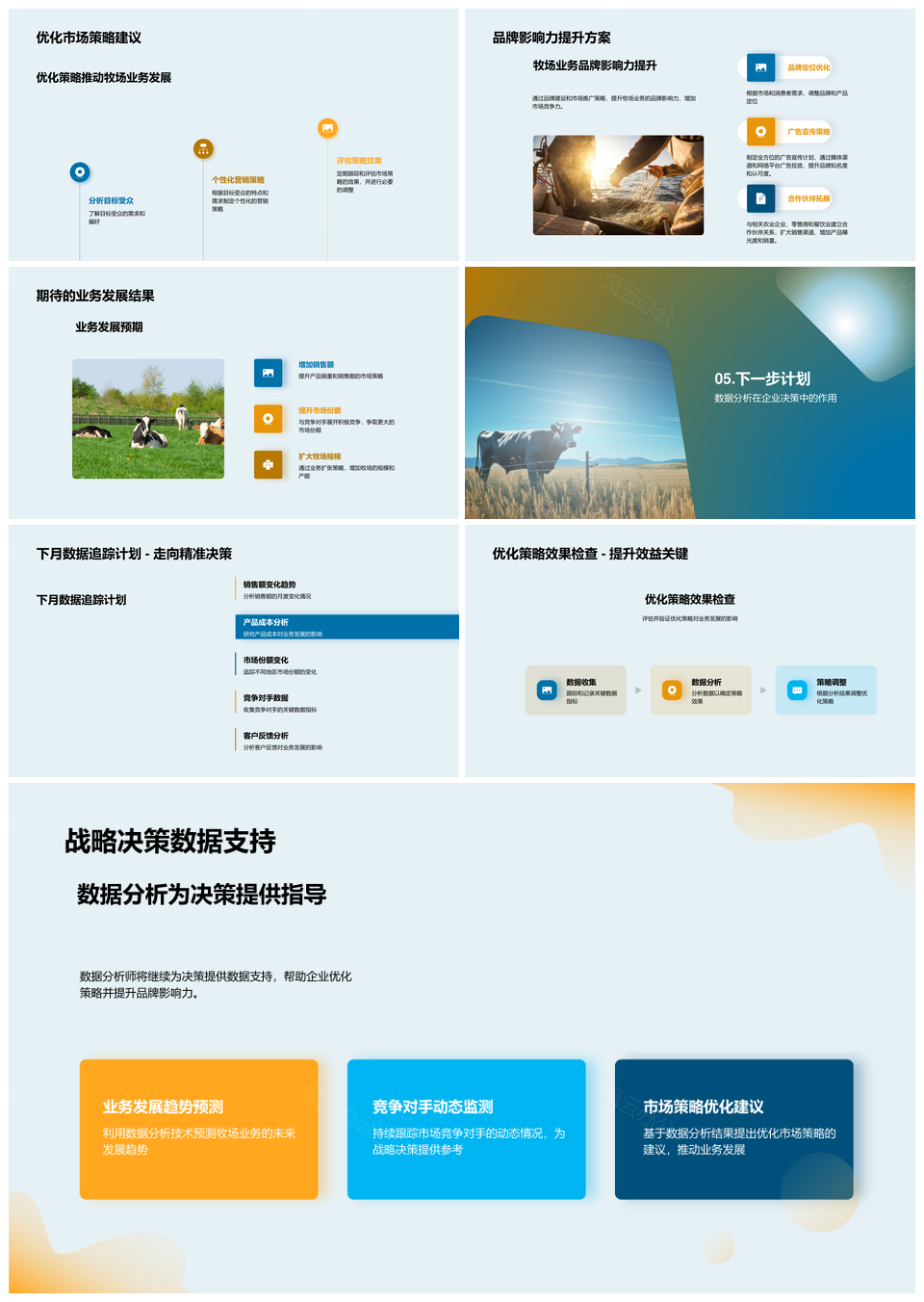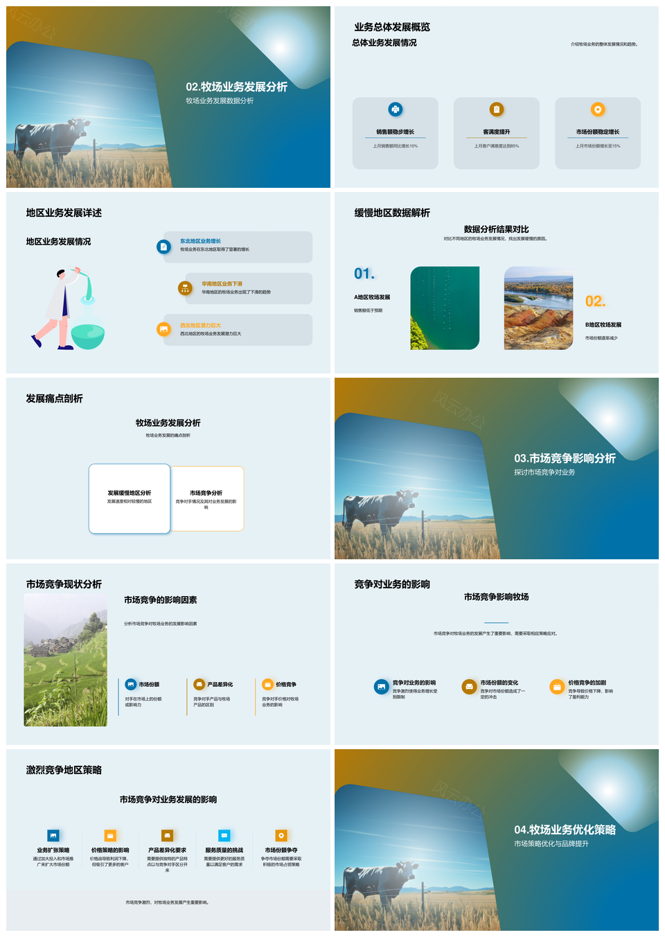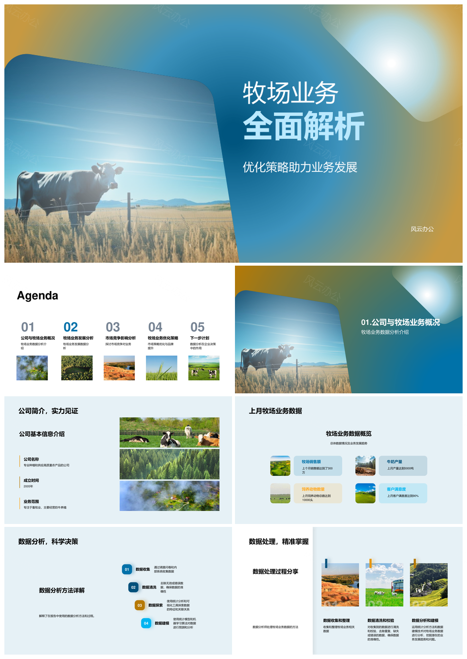 风云办公提供的牧场业务数据分析优化发展竞争策略PPT模板,下载格式为pptx,一共25页,作品中文字及图均可以修改和编辑,图片更改请在作品中右键图片并更换,文字修改请直接点击文字进行修改。