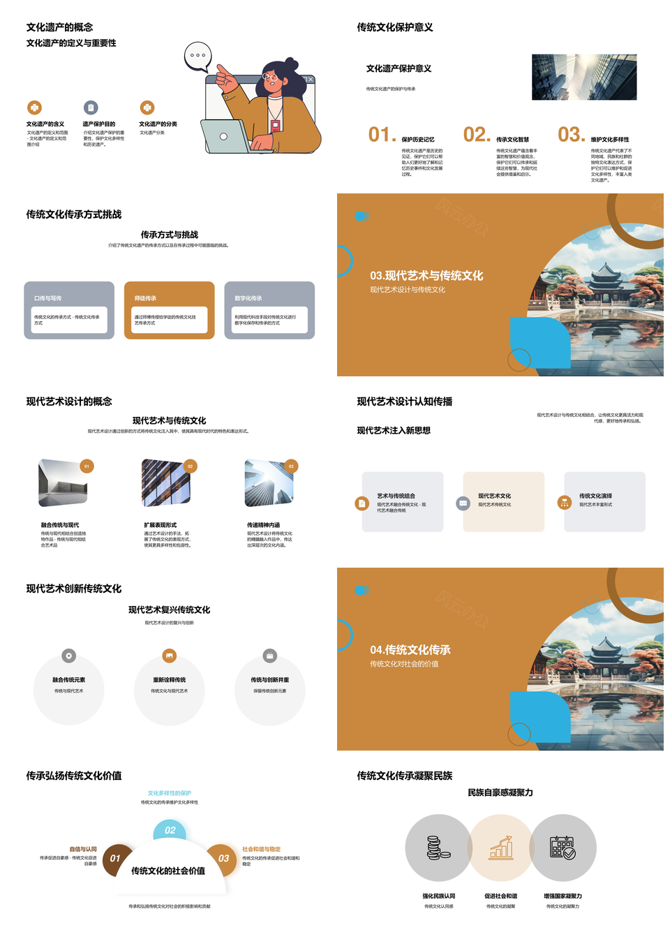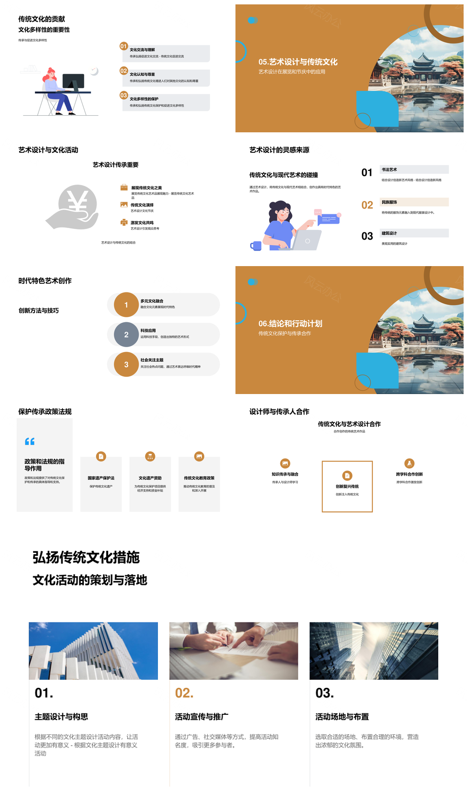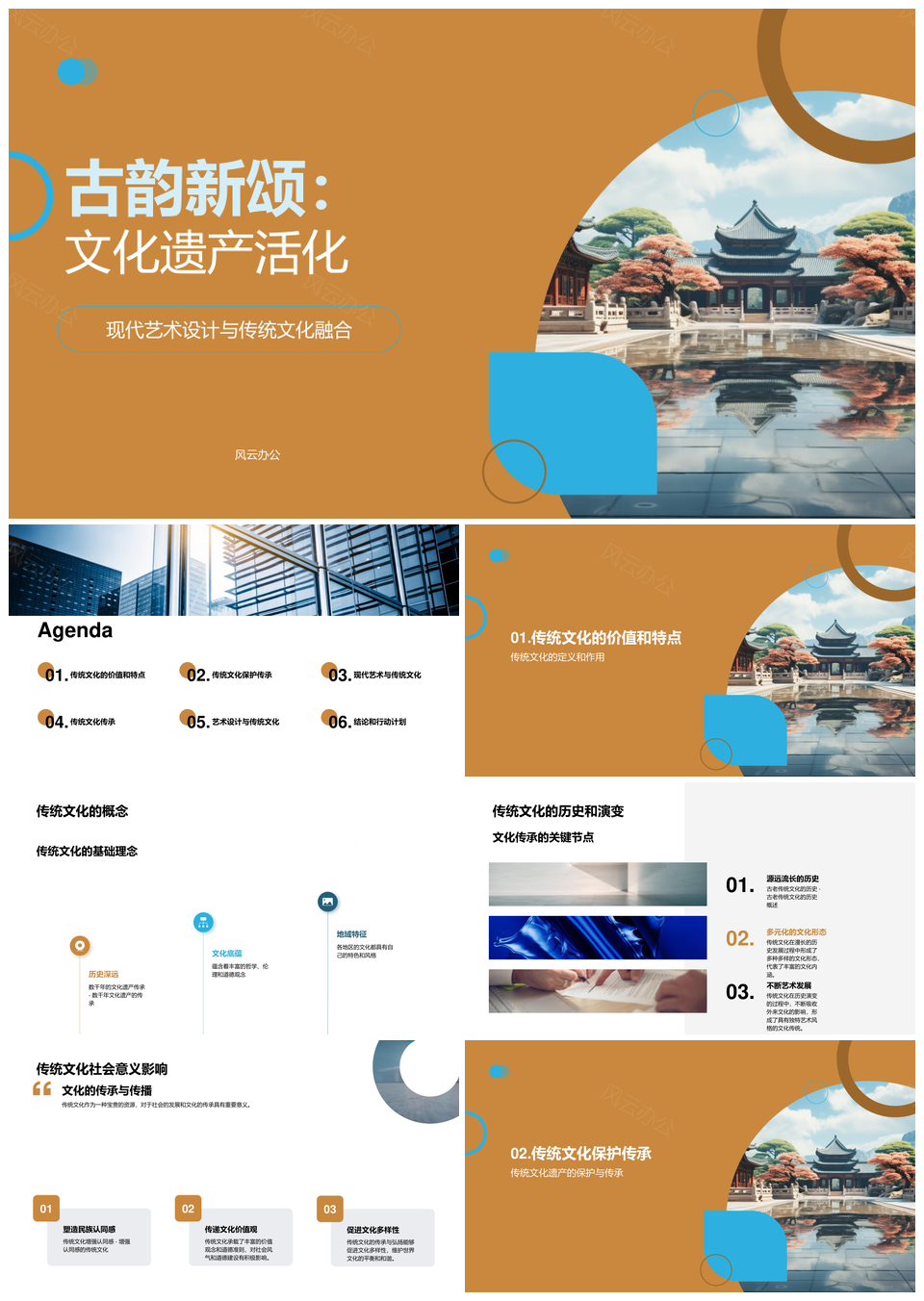 风云办公提供的艺术设计活化古建传承历史演变文化PPT模板,下载格式为pptx,一共27页,作品中文字及图均可以修改和编辑,图片更改请在作品中右键图片并更换,文字修改请直接点击文字进行修改。