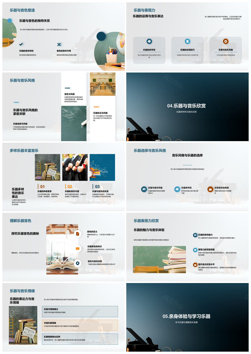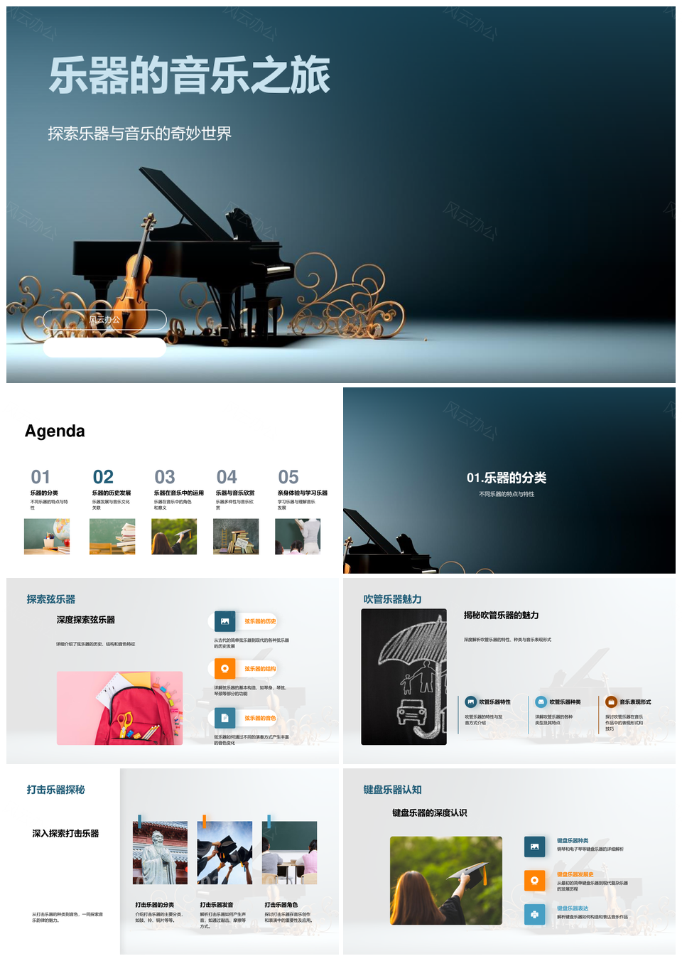 风云办公提供的弦吹打键电乐器音乐文化之旅PPT模板,下载格式为pptx,一共33页,作品中文字及图均可以修改和编辑,图片更改请在作品中右键图片并更换,文字修改请直接点击文字进行修改。