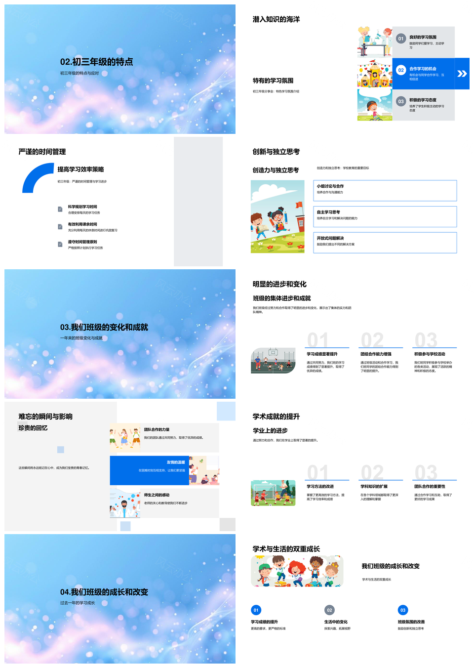 这是一张初三学习生活实践报告学休平衡活动时间管理创新提升PPT模板,包含初三、学习生活、实践报告、学休平衡、活动、时间管理、创新提升等主题内容,也可用作初三学习生活实践、学习生活实践报告、学休平衡活动时间、平衡活动时间管理、活动时间管理创新、时间管理创新提升、初三学习生活、学习生活实践、生活实践报告、学休平衡活动、平衡活动时间、活动时间管理、时间管理创新、管理创新提升、创新提升等PPT场景使用。 风云办公提供的初三学习生活实践报告学休平衡活动时间管理创新提升PPT模板,下载格式为pptx,一共24页,作品中文字及图均可以修改和编辑,图片更改请在作品中右键图片并更换,文字修改请直接点击文字进行修改。