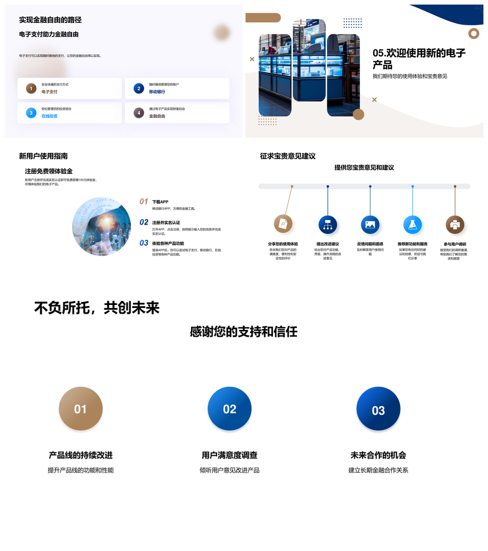 这是一张电子银行新时代新电子产品线助力金融自由PPT模板,包含电子银行、新时代、新电子产品线、助力、金融自由等主题内容,也可用作电子银行新时代新电子产品线、新时代新电子产品线助力、新电子产品线助力金融自由、电子银行产品线助力金融自由、电子银行新时代助力金融自由、电子银行新电子产品线助力、新时代产品线助力金融自由、新电子产品线助力、产品线助力金融自由、电子银行助力金融自由、新时代新电子产品线、电子银行新时代新电子、新时代助力金融自由、新电子助力金融自由、助力金融自由等PPT场景使用。 风云办公提供的电子银行新时代新电子产品线助力金融自由PPT模板,下载格式为pptx,一共23页,作品中文字及图均可以修改和编辑,图片更改请在作品中右键图片并更换,文字修改请直接点击文字进行修改。