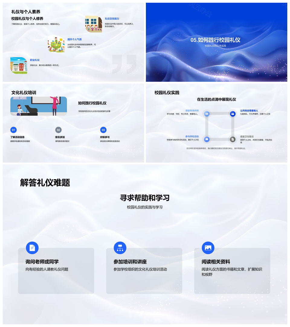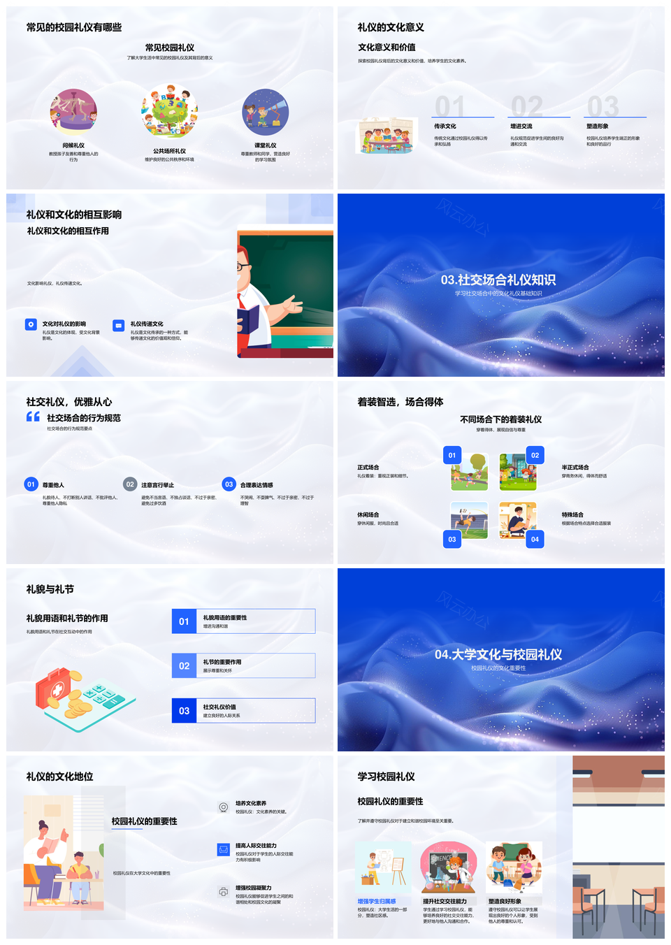 这是一张大学新生校园礼仪文化培训PPT模板,包含大学新生、校园、礼仪文化、培训等主题内容,也可用作大学新生校园礼仪、新生校园礼仪文化、校园礼仪文化培训、大学新生校园、新生校园礼仪、校园礼仪文化、礼仪文化培训、大学新生、新生校园、校园礼仪、礼仪文化、文化培训等PPT场景使用。 风云办公提供的大学新生校园礼仪文化培训PPT模板,下载格式为pptx,一共23页,作品中文字及图均可以修改和编辑,图片更改请在作品中右键图片并更换,文字修改请直接点击文字进行修改。