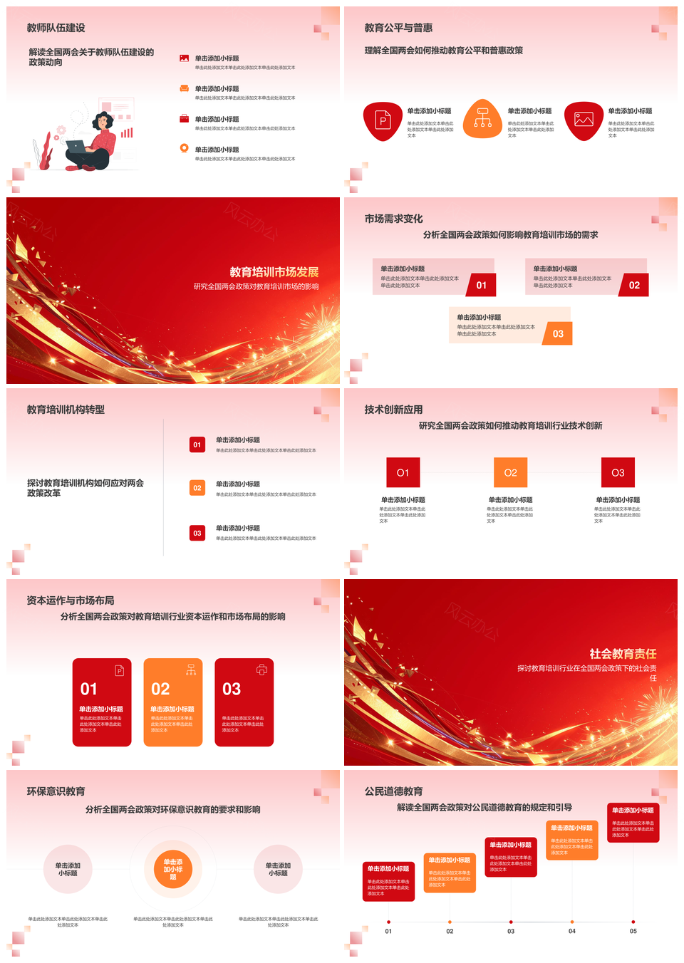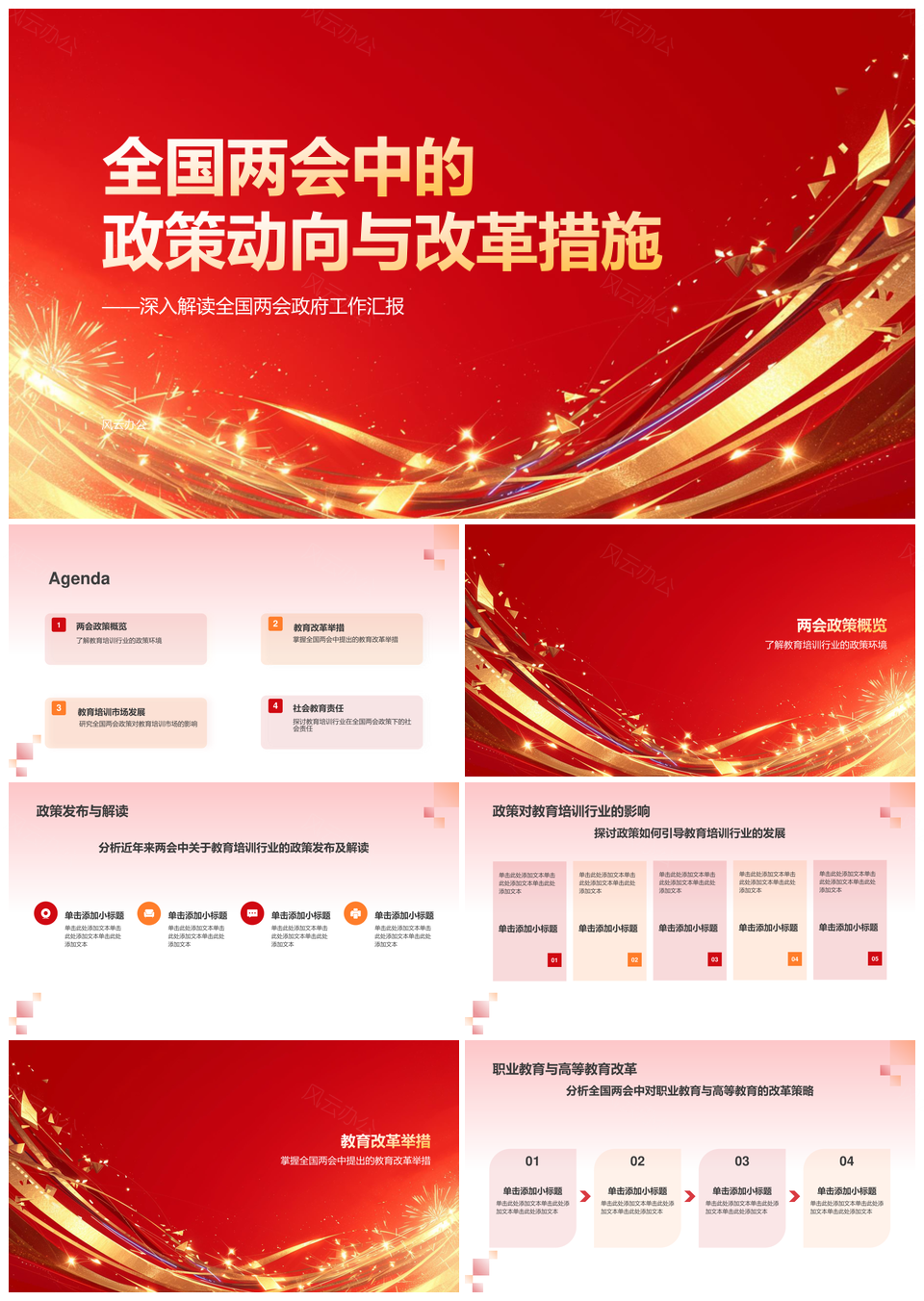 这是一张全国两会政府汇报教改政策助力社会发展贡献PPT模板,包含全国两会、政府、汇报、教改、政策、助力、社会发展、贡献等主题内容,也可用作全国两会政府汇报教改政策、全国两会政府助力社会发展、全国两会教改政策助力贡献、政府汇报教改政策社会发展、教改政策助力社会发展贡献、全国两会社会发展贡献、政府助力社会发展贡献、汇报教改政策助力贡献、全国两会助力社会发展、教改政策社会发展贡献、政府汇报社会发展贡献、助力社会发展贡献、社会发展贡献、教改政策助力、政府助力等PPT场景使用。 风云办公提供的全国两会政府汇报教改政策助力社会发展贡献PPT模板,下载格式为pptx,一共20页,作品中文字及图均可以修改和编辑,图片更改请在作品中右键图片并更换,文字修改请直接点击文字进行修改。