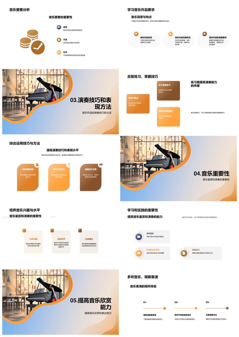 风云办公提供的音乐鉴赏表演技巧与作品要素解析PPT模板,下载格式为pptx,一共21页,作品中文字及图均可以修改和编辑,图片更改请在作品中右键图片并更换,文字修改请直接点击文字进行修改。