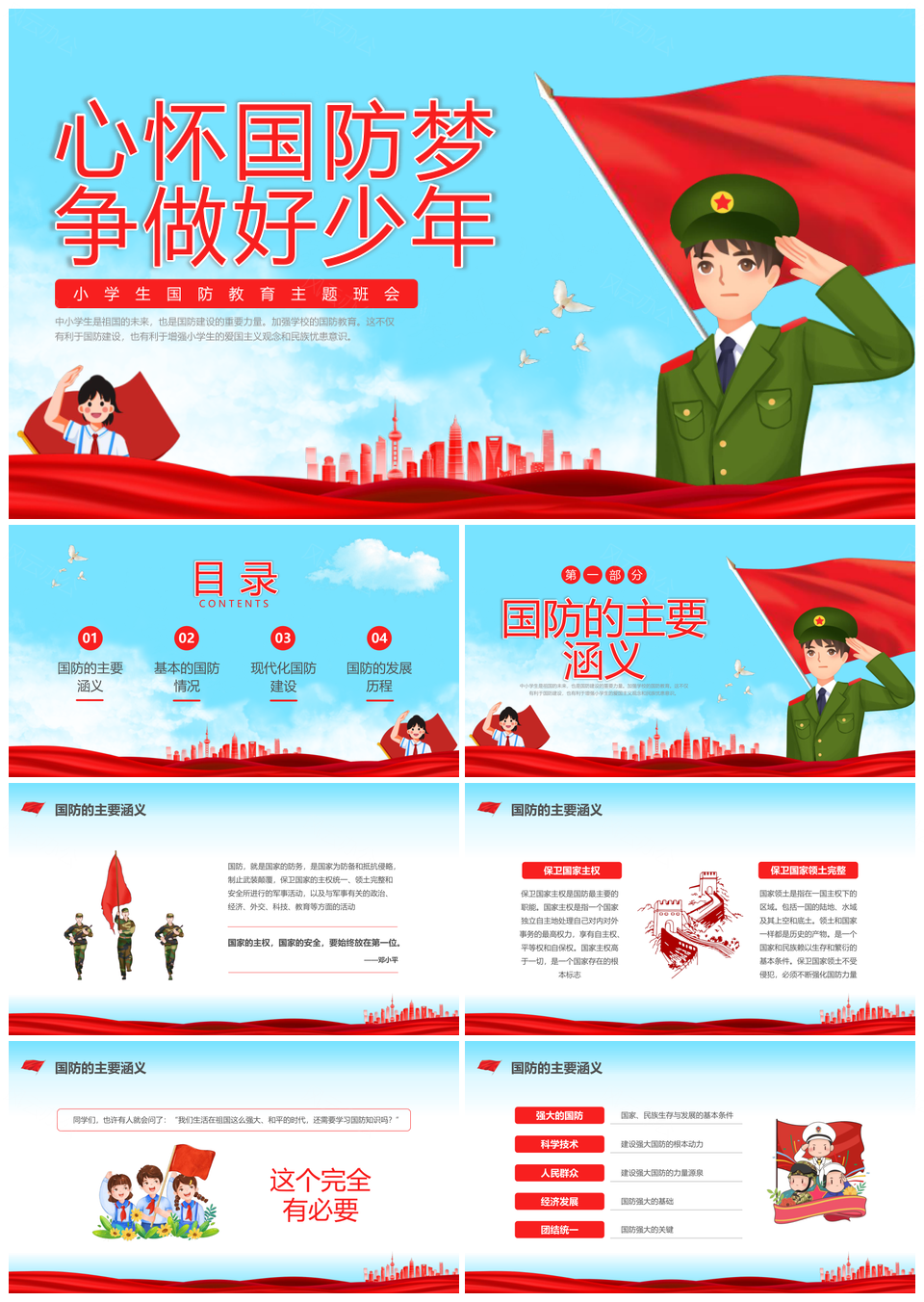 这是一张小学生红色清新国防教育主题班会PPT模板,包含小学生、红色、清新、国防教育、主题班会等主题内容,也可用作小学生红色清新国防教育、红色清新国防教育主题班会、清新国防教育主题班会、小学生红色清新主题班会、红色国防教育主题班会、小学生国防教育主题班会、红色清新国防教育、小学生红色国防教育、国防教育主题班会、红色国防教育、小学生国防教育、清新国防教育、红色主题班会、国防教育班会、主题班会国防教育等PPT场景使用。