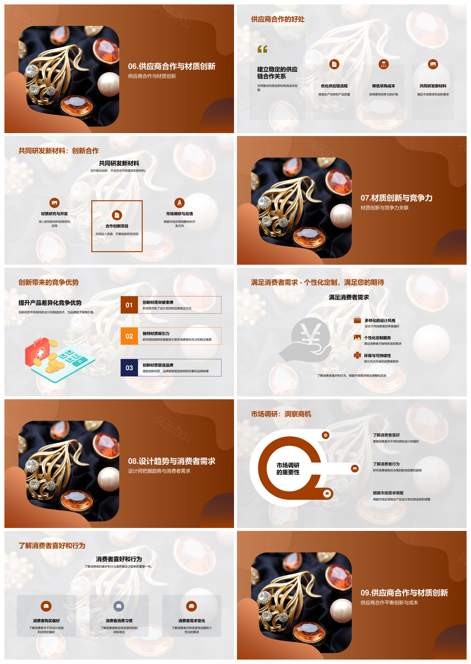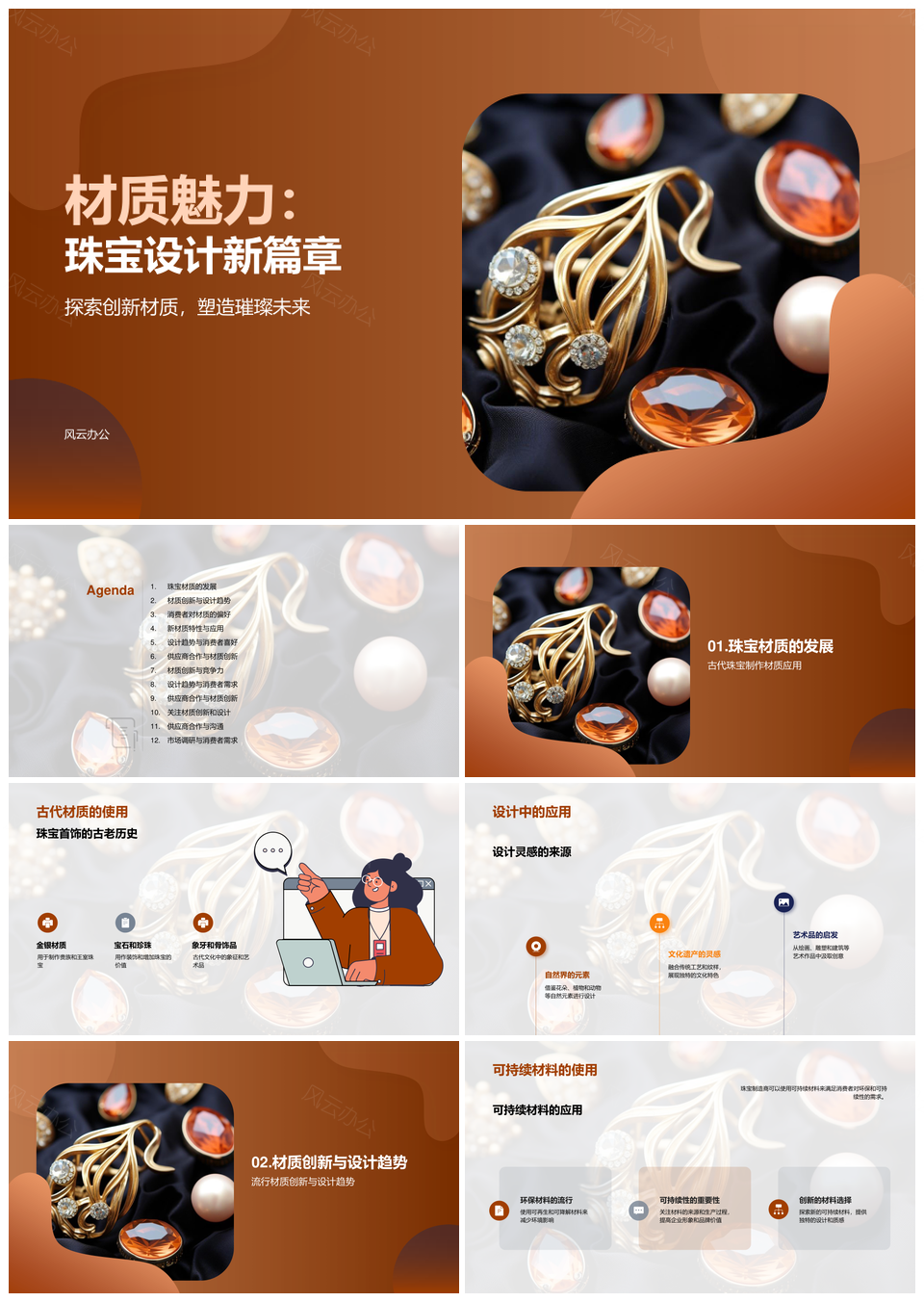 风云办公提供的珠宝材质创新古今融合设计新趋势PPT模板,下载格式为pptx,一共39页,作品中文字及图均可以修改和编辑,图片更改请在作品中右键图片并更换,文字修改请直接点击文字进行修改。