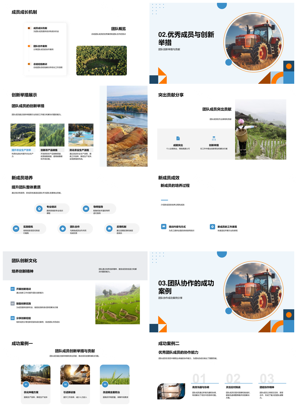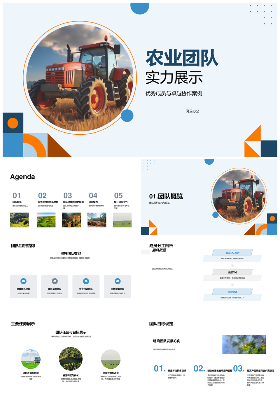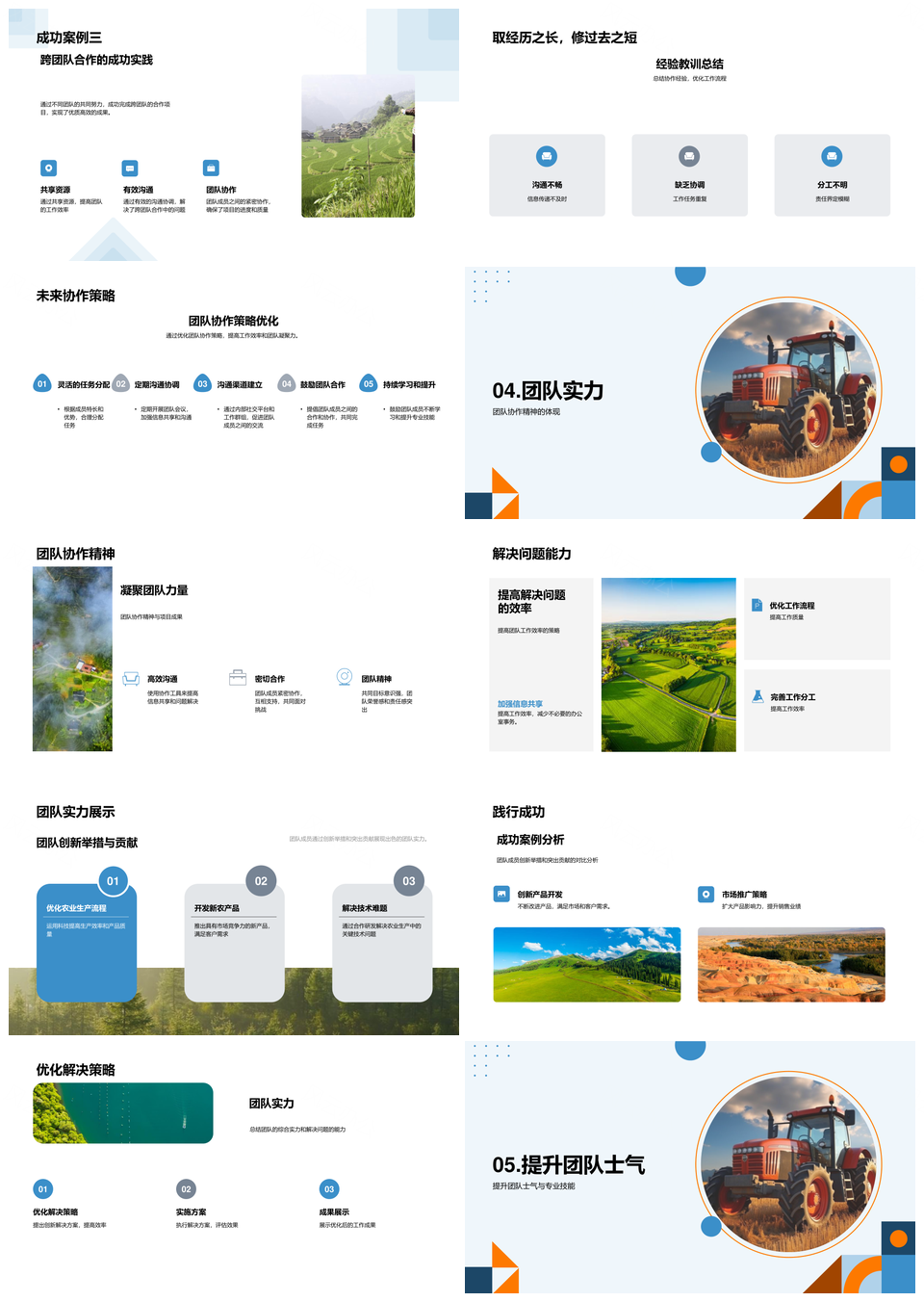 风云办公提供的农业团队卓越协作创新麦田管理PPT模板,下载格式为pptx,一共33页,作品中文字及图均可以修改和编辑,图片更改请在作品中右键图片并更换,文字修改请直接点击文字进行修改。