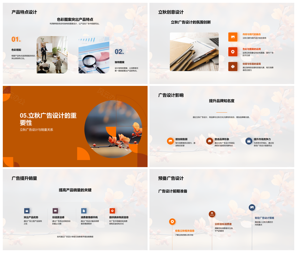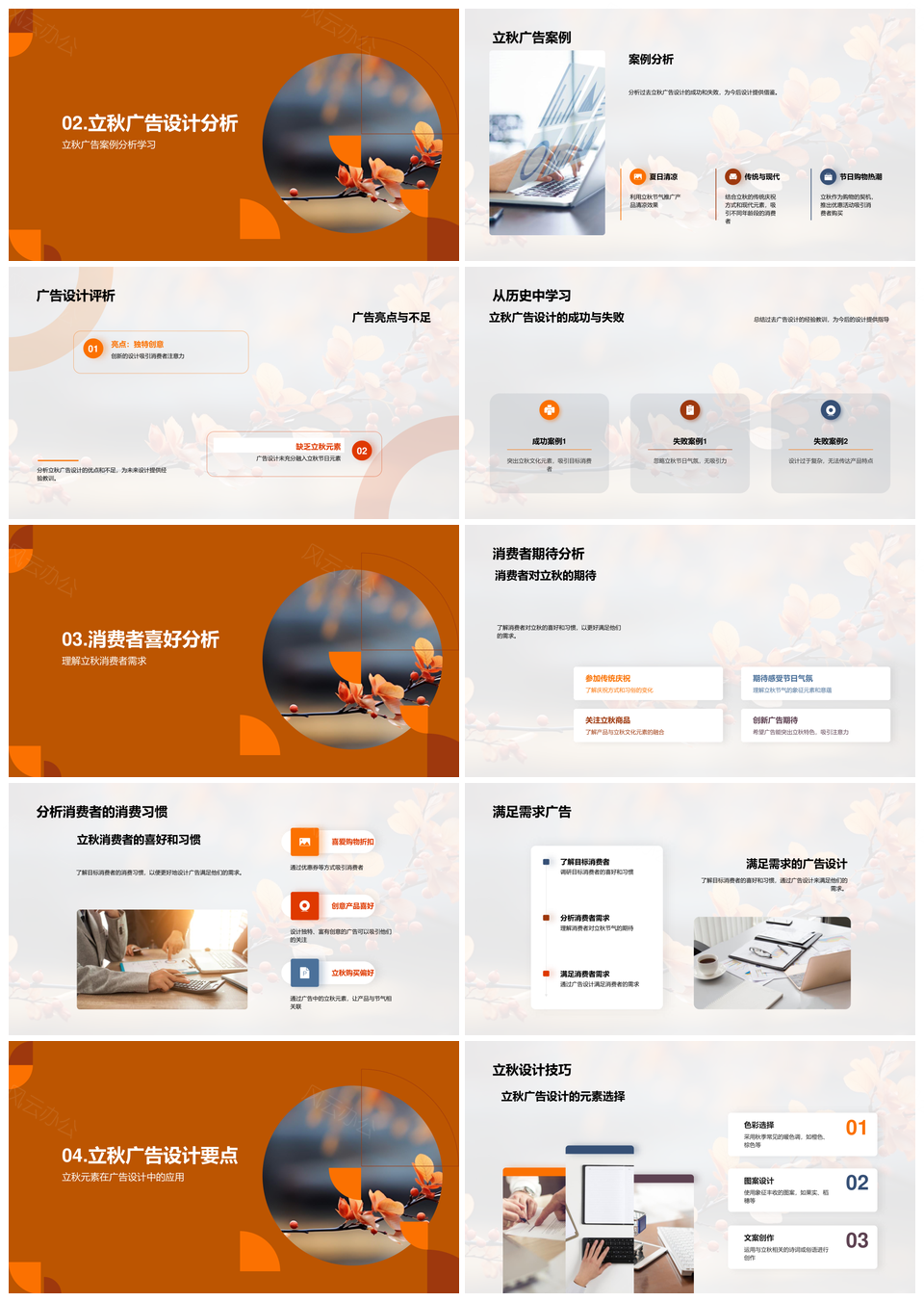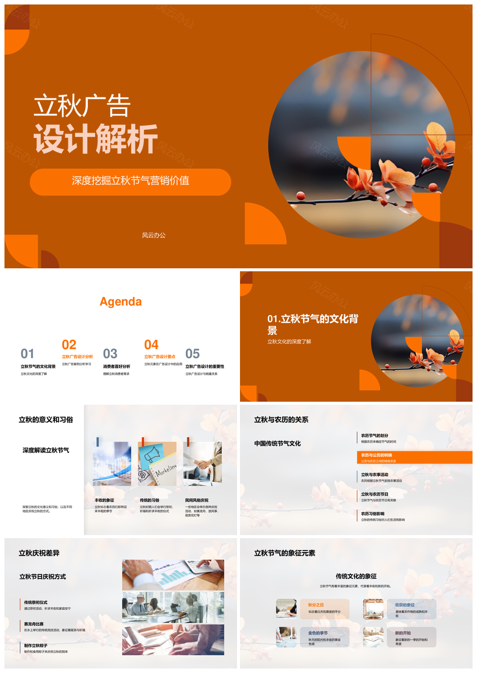 风云办公提供的立秋广告设计策略与节气文化习俗分析PPT模板,下载格式为pptx,一共24页,作品中文字及图均可以修改和编辑,图片更改请在作品中右键图片并更换,文字修改请直接点击文字进行修改。