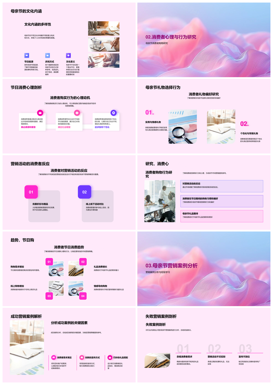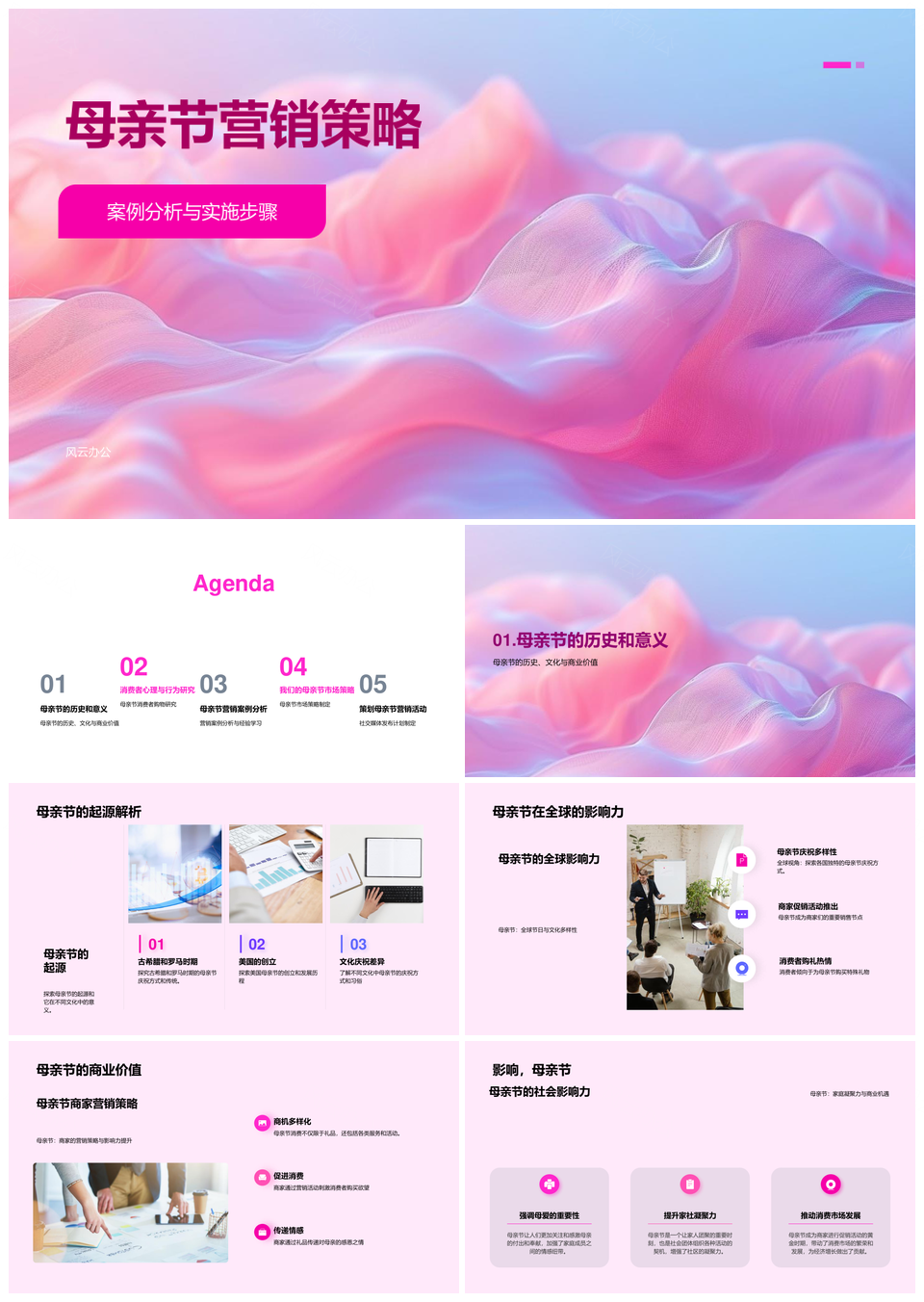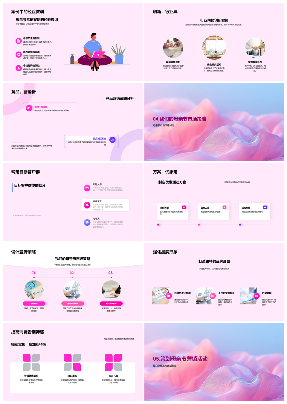 这是一张母亲节营销策略消费者礼品优惠社交宣传案例分析PPT模板,包含母亲节、营销策略、消费者、礼品、优惠、社交、宣传、案例分析等主题内容,也可用作母亲节营销策略消费者礼品、母亲节营销策略礼品优惠、营销策略消费者礼品优惠、消费者礼品优惠社交宣传、礼品优惠社交宣传案例分析、母亲节礼品优惠案例分析、社交宣传案例分析母亲节、消费者礼品优惠案例分析、营销策略案例分析社交宣传、母亲节消费者礼品优惠、母亲节优惠社交宣传、营销策略优惠社交宣传、礼品优惠社交宣传、案例分析社交宣传、母亲节礼品优惠等PPT场景使用。 风云办公提供的母亲节营销策略消费者礼品优惠社交宣传案例分析PPT模板,下载格式为pptx,一共33页,作品中文字及图均可以修改和编辑,图片更改请在作品中右键图片并更换,文字修改请直接点击文字进行修改。