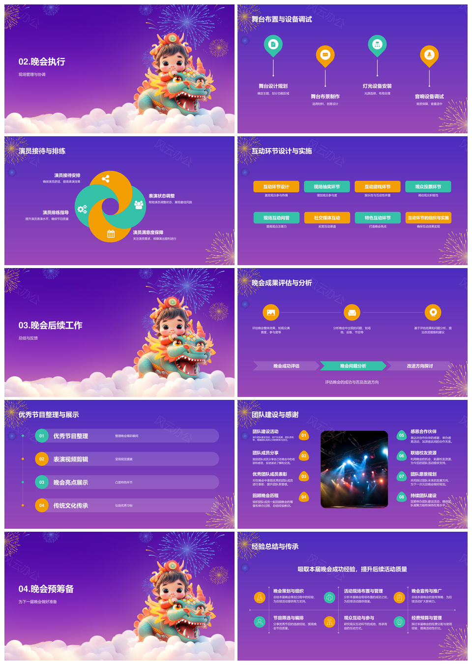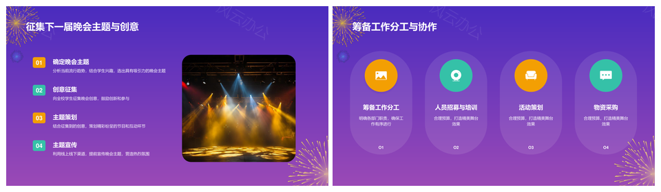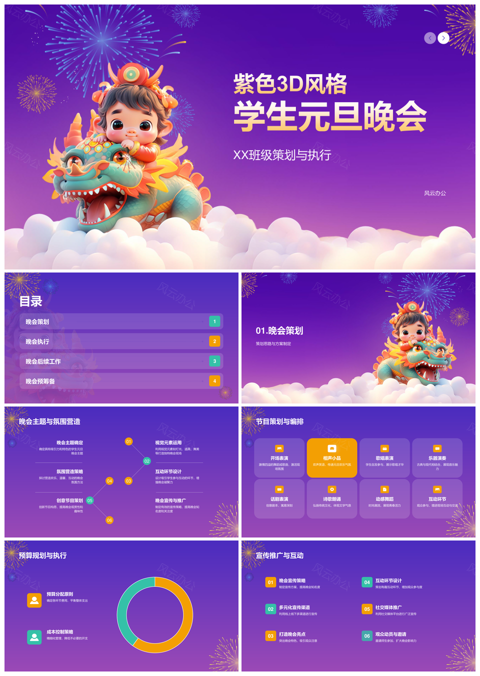 风云办公提供的紫黄创意学生元旦晚会烟花祥云活动PPT模板,下载格式为pptx,一共20页,作品中文字及图均可以修改和编辑,图片更改请在作品中右键图片并更换,文字修改请直接点击文字进行修改。
