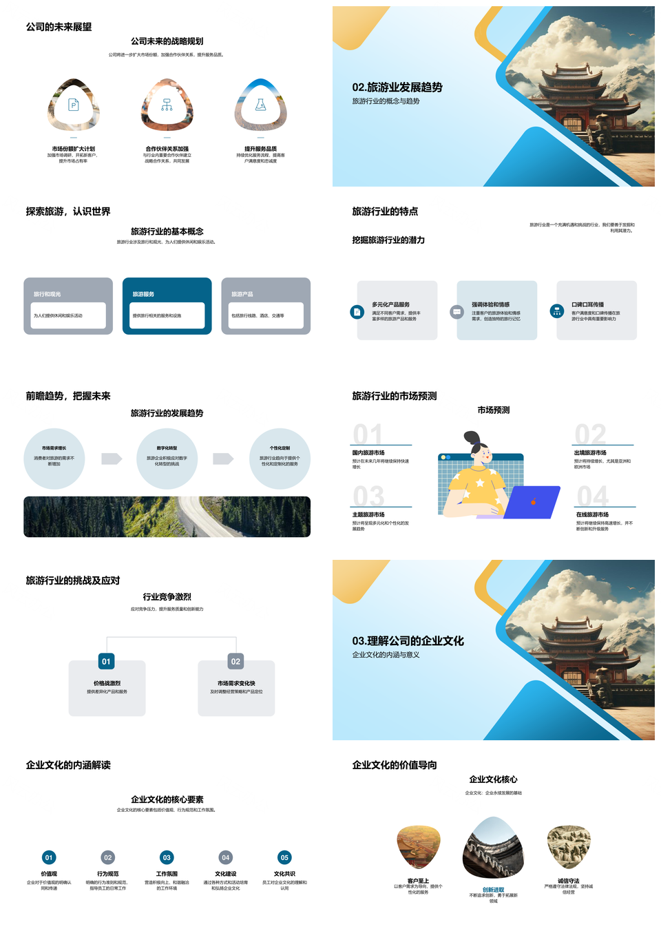 这是一张文旅企业创新服务驱动古建市场趋势发展PPT模板,包含文旅企业、创新服务、驱动、古建市场、趋势、发展等主题内容,也可用作文旅企业创新服务驱动、文旅企业驱动古建市场、文旅企业服务驱动发展、创新服务驱动古建市场、创新驱动古建市场趋势、服务驱动古建市场发展、文旅企业市场趋势发展、创新服务驱动市场趋势、文旅驱动古建市场趋势、企业创新服务驱动发展、古建市场趋势发展、文旅企业创新驱动发展、创新驱动市场趋势发展、服务驱动古建趋势发展、企业驱动古建市场趋势等PPT场景使用。 风云办公提供的文旅企业创新服务驱动古建市场趋势发展PPT模板,下载格式为pptx,一共33页,作品中文字及图均可以修改和编辑,图片更改请在作品中右键图片并更换,文字修改请直接点击文字进行修改。