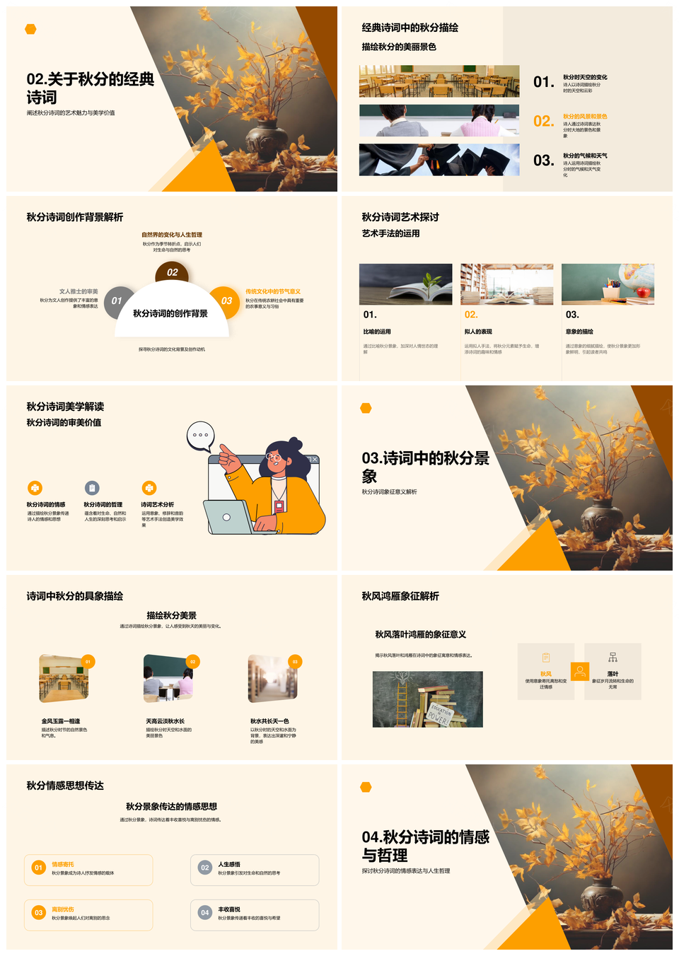 风云办公提供的秋分诗词传统文化天文艺术美学情感PPT模板,下载格式为pptx,一共25页,作品中文字及图均可以修改和编辑,图片更改请在作品中右键图片并更换,文字修改请直接点击文字进行修改。