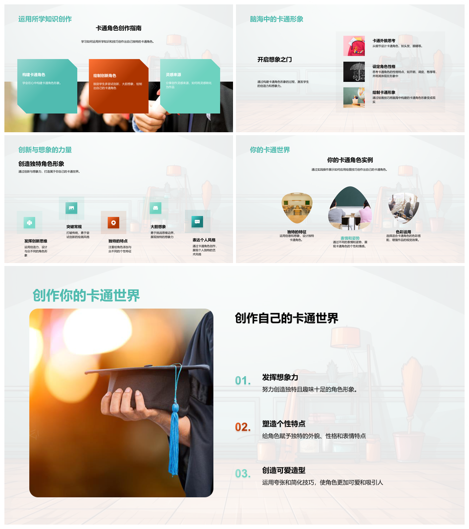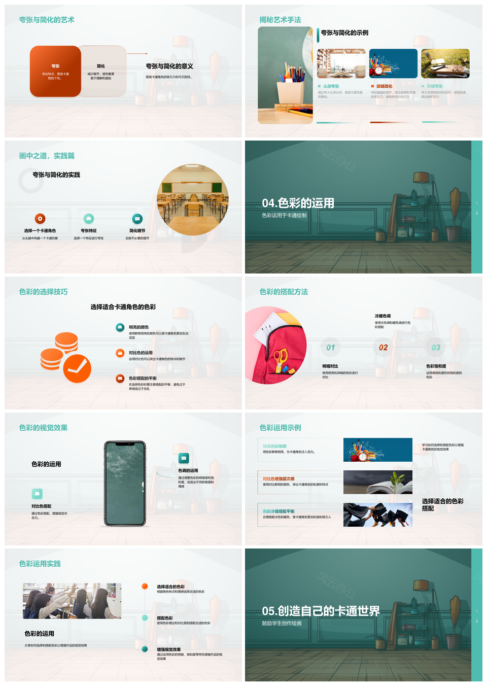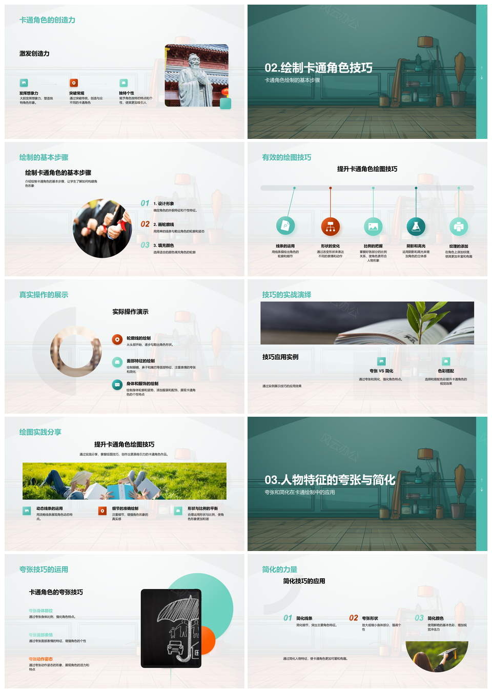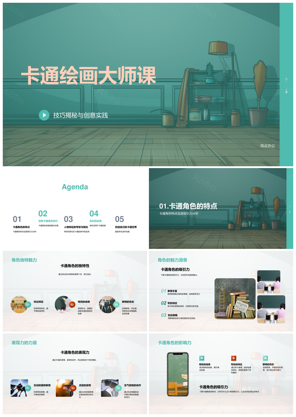 风云办公提供的卡通角色创作技巧夸张色彩美术大师课PPT模板,下载格式为pptx,一共33页,作品中文字及图均可以修改和编辑,图片更改请在作品中右键图片并更换,文字修改请直接点击文字进行修改。