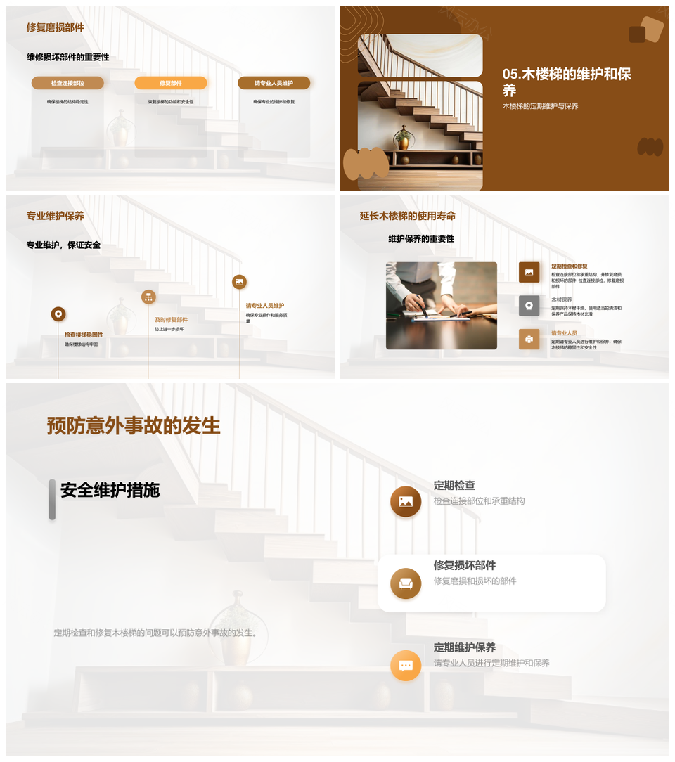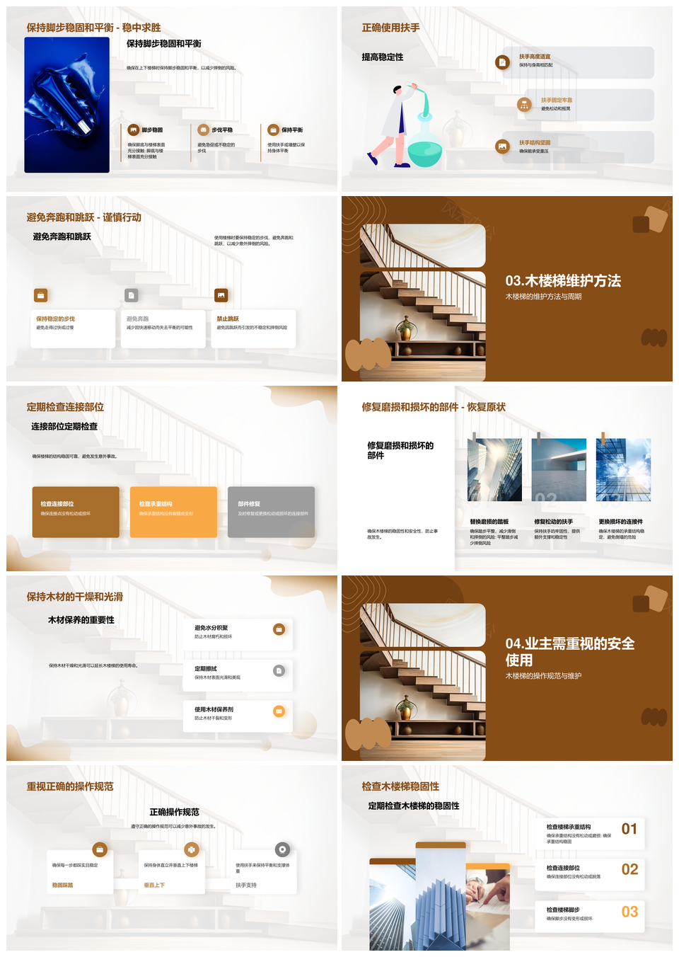 这是一张木楼梯安全维护防滑承重防腐防倒塌PPT模板,包含木楼梯、安全、维护、防滑、承重、防腐、防倒塌等主题内容,也可用作木楼梯安全维护防滑、安全维护防滑承重、维护防滑承重防腐、防滑承重防腐防倒塌、木楼梯安全维护、安全维护防滑、维护防滑承重、防滑承重防腐、承重防腐防倒塌、木楼梯安全、安全维护、维护防滑、防滑承重、承重防腐、防腐防倒塌等PPT场景使用。