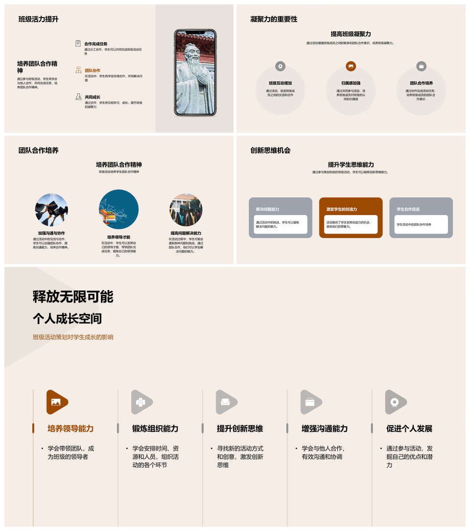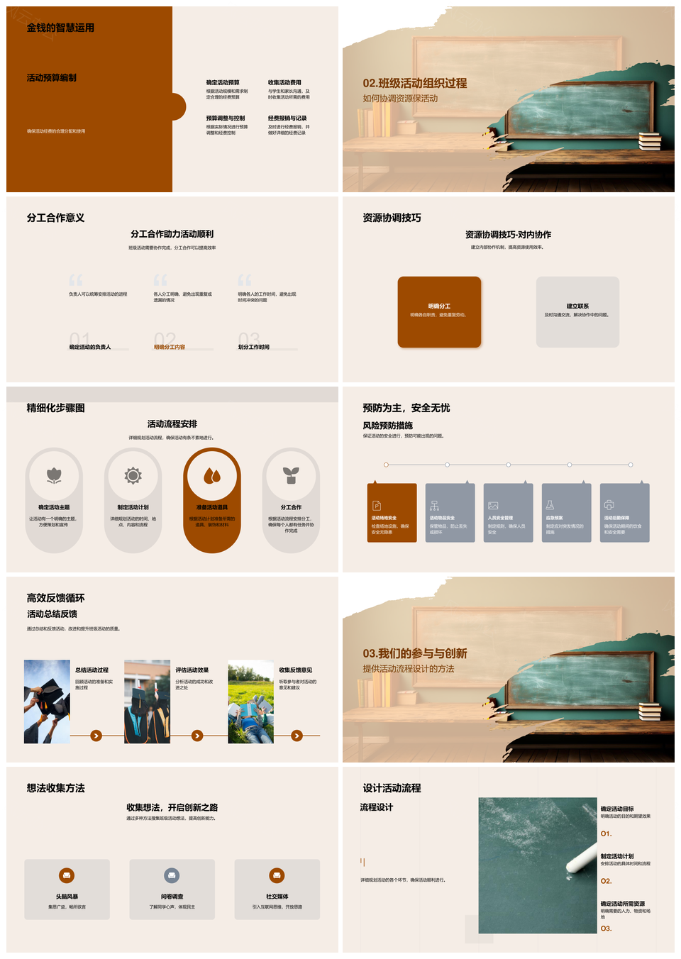 这是一张班级活动筹划协作创新策划目标内容时空安排PPT模板,包含班级活动、筹划、协作、创新、策划、目标、内容、时空、安排等主题内容,也可用作班级活动筹划协作创新、筹划协作创新策划、协作创新策划目标、创新策划目标内容、目标内容时空安排、班级活动筹划协作、筹划协作创新、协作创新策划、创新策划目标、策划目标内容、内容时空安排、班级活动筹划、筹划协作、协作创新、创新策划等PPT场景使用。 风云办公提供的班级活动筹划协作创新策划目标内容时空安排PPT模板,下载格式为pptx,一共33页,作品中文字及图均可以修改和编辑,图片更改请在作品中右键图片并更换,文字修改请直接点击文字进行修改。