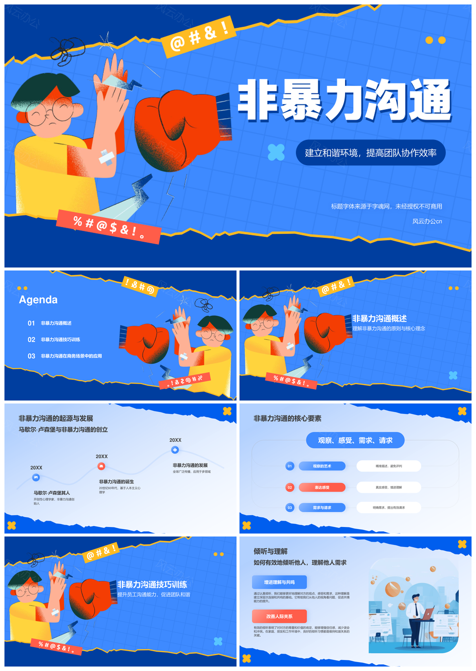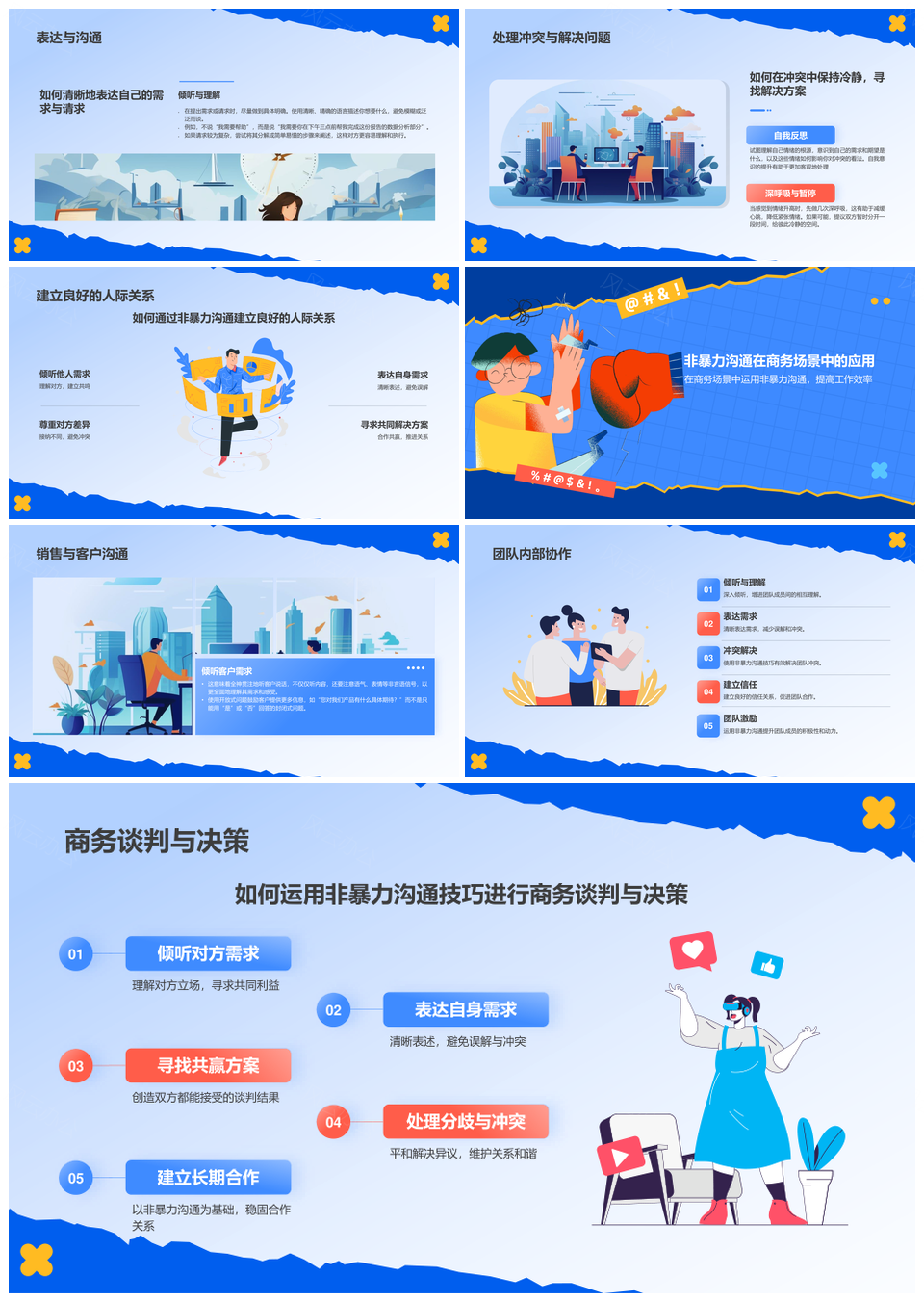 这是一张非暴力沟通商务培训提升团队协作和谐环境PPT模板,包含非暴力沟通、商务培训、提升、团队协作、和谐环境等主题内容,也可用作非暴力沟通商务培训提升团队协作、商务培训提升团队协作和谐环境、非暴力沟通商务培训提升、商务培训提升团队协作、提升团队协作和谐环境、非暴力沟通商务培训团队协作、商务培训团队协作和谐环境、非暴力沟通团队协作和谐环境、非暴力沟通商务培训和谐环境、非暴力沟通商务培训、商务培训提升、提升团队协作、团队协作和谐环境、非暴力沟通团队协作、商务培训团队协作等PPT场景使用。 风云办公提供的非暴力沟通商务培训提升团队协作和谐环境PPT模板,下载格式为pptx,一共15页,作品中文字及图均可以修改和编辑,图片更改请在作品中右键图片并更换,文字修改请直接点击文字进行修改。