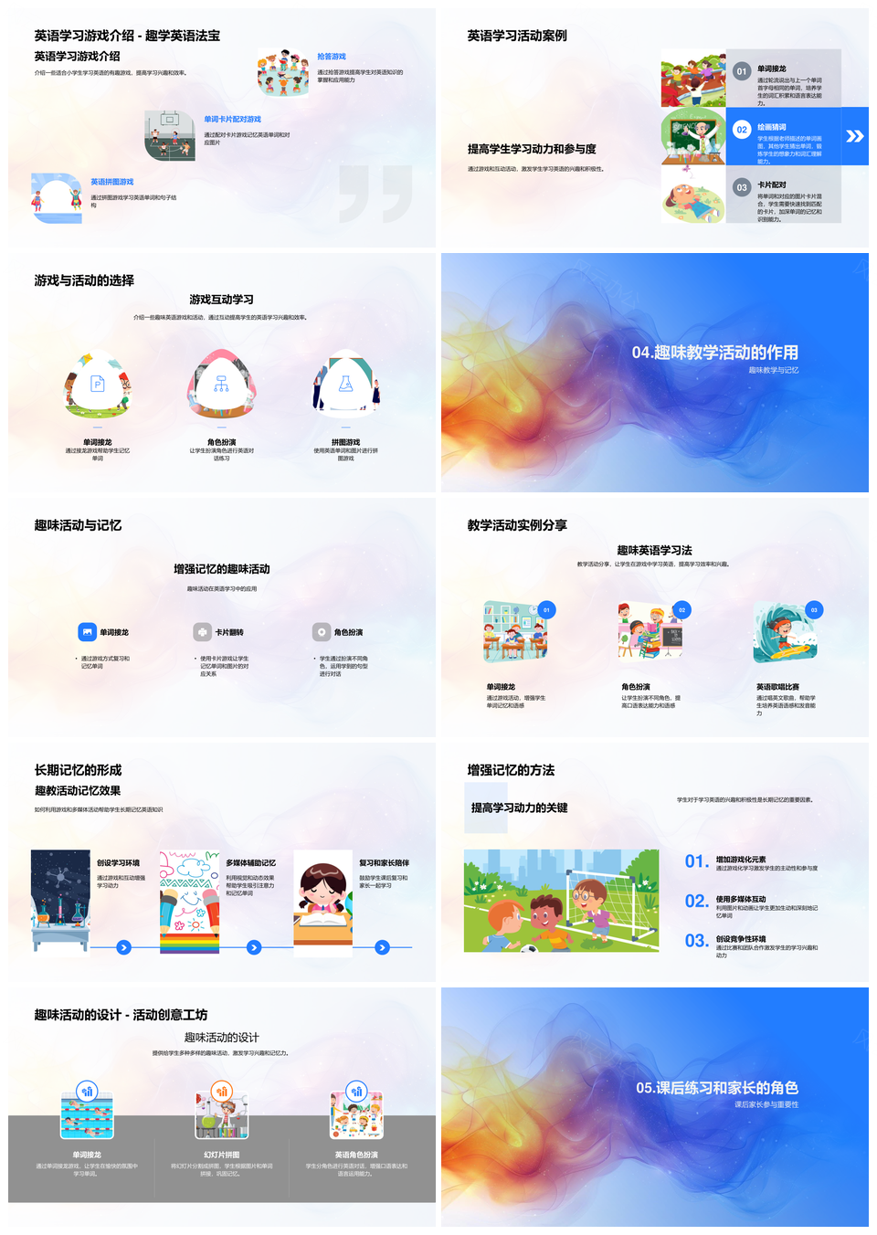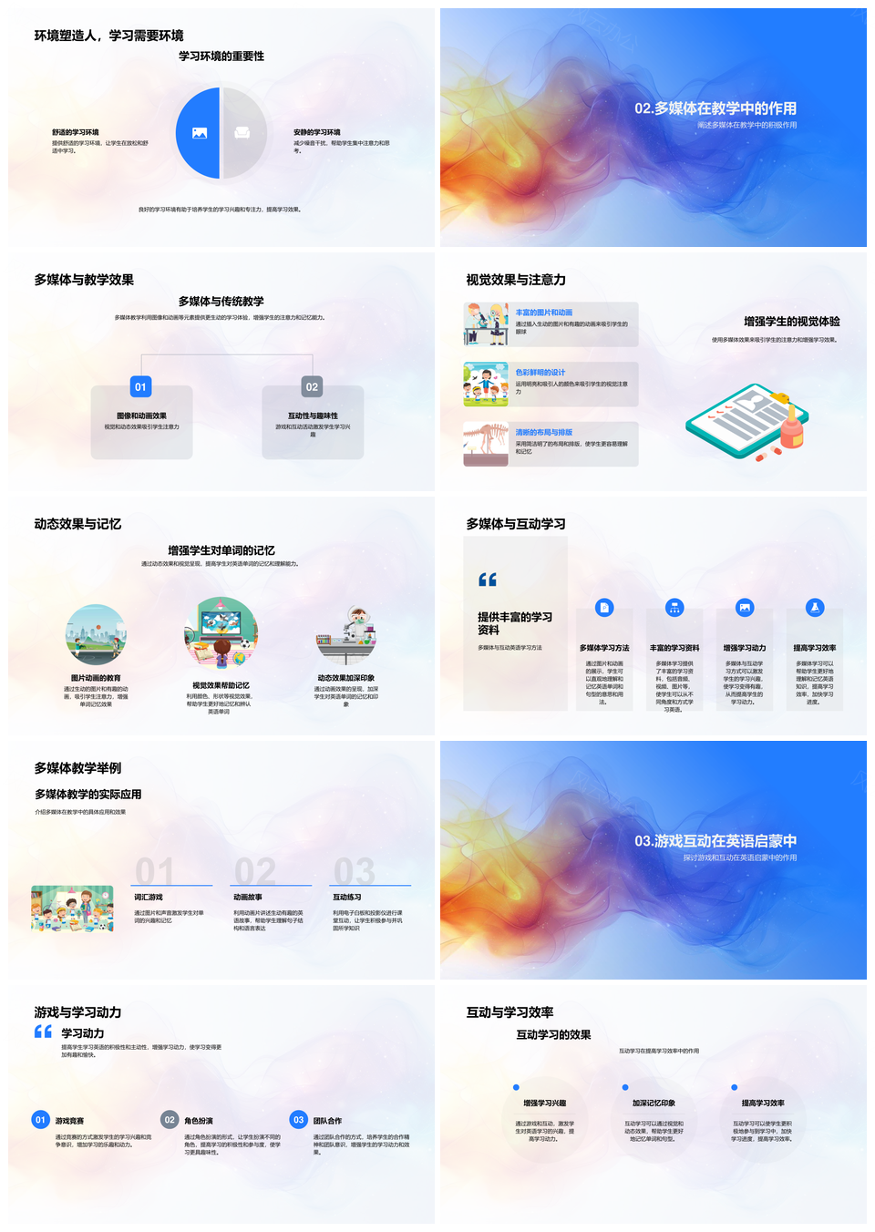 这是一张小学英语互动多媒体黄金期高效认知教学PPT模板,包含小学英语、互动、多媒体、黄金期、高效、认知、教学等主题内容,也可用作小学英语互动多媒体、英语互动多媒体黄金期、互动多媒体黄金期高效、多媒体黄金期高效认知、黄金期高效认知教学、小学英语互动、英语互动多媒体、互动多媒体黄金期、多媒体黄金期高效、黄金期高效认知、高效认知教学、小学英语教学、小学英语高效、黄金期认知教学、高效教学等PPT场景使用。 风云办公提供的小学英语互动多媒体黄金期高效认知教学PPT模板,下载格式为pptx,一共33页,作品中文字及图均可以修改和编辑,图片更改请在作品中右键图片并更换,文字修改请直接点击文字进行修改。