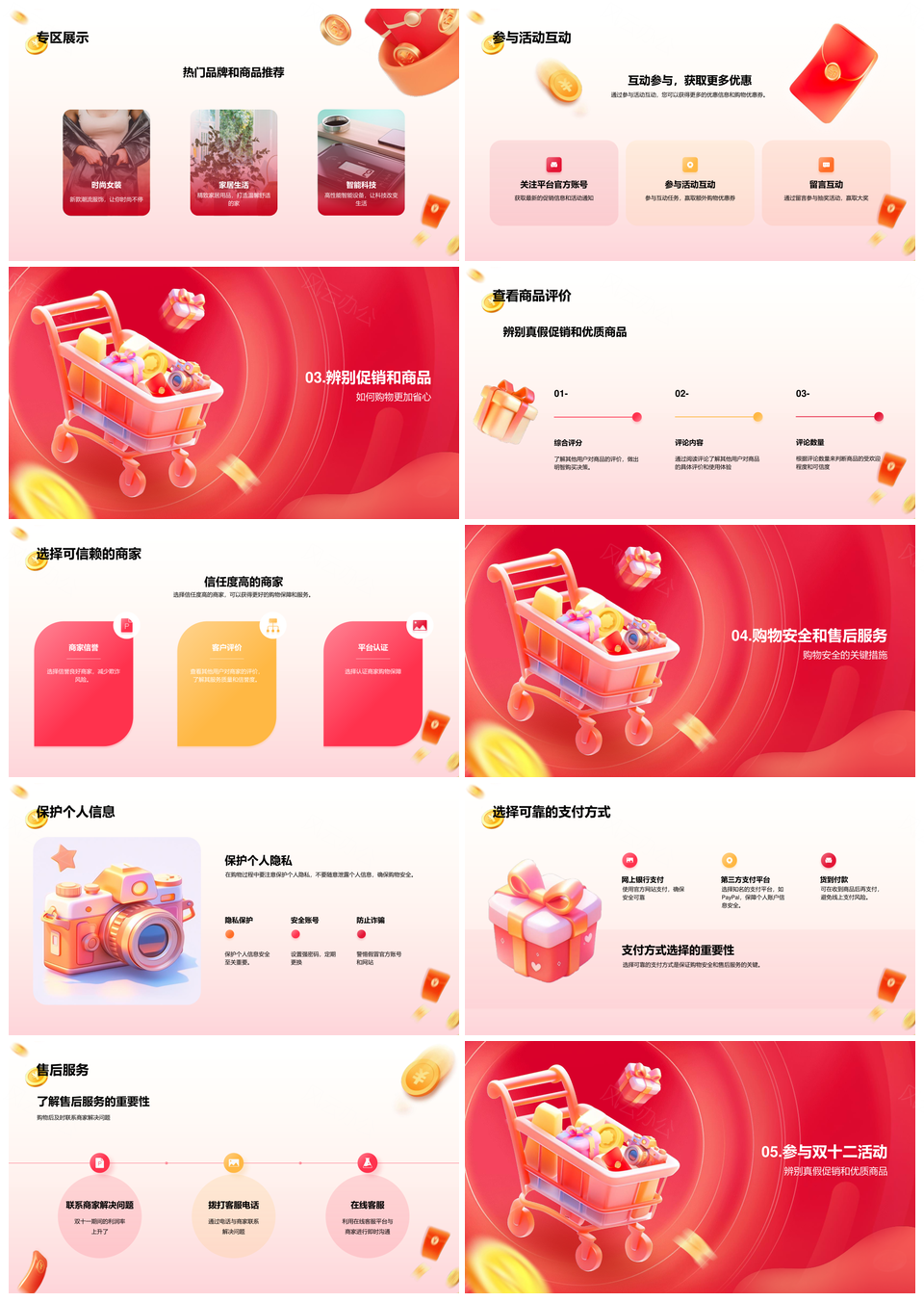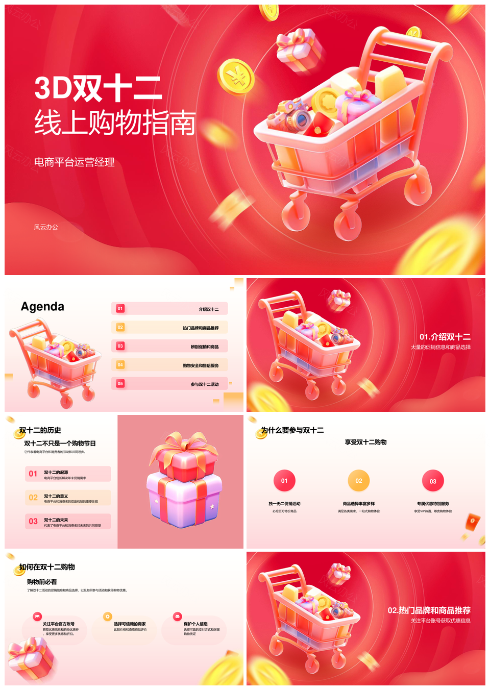 风云办公提供的双十二电商促销购物指南PPT模板,下载格式为pptx,一共20页,作品中文字及图均可以修改和编辑,图片更改请在作品中右键图片并更换,文字修改请直接点击文字进行修改。