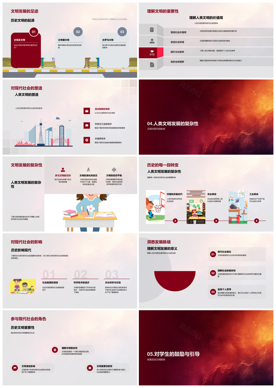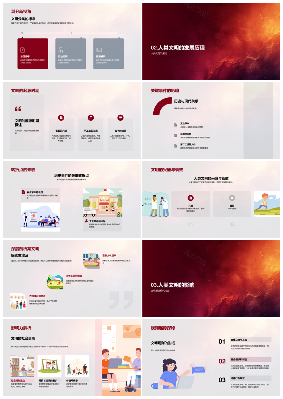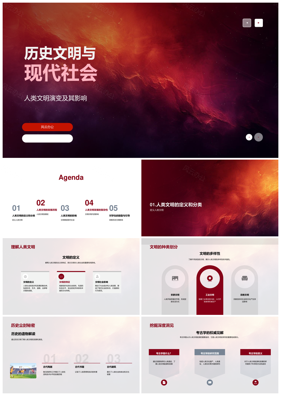 风云办公提供的人类文明演变历程及其对现代社会影响PPT模板,下载格式为pptx,一共33页,作品中文字及图均可以修改和编辑,图片更改请在作品中右键图片并更换,文字修改请直接点击文字进行修改。