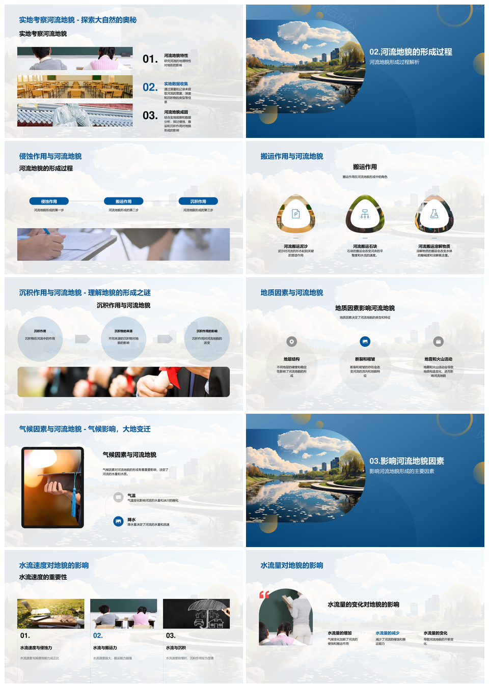 这是一张河流地貌侵蚀搬运沉积与水流地形气候解析PPT模板,包含河流、地貌、侵蚀、搬运、沉积、水流、地形、气候等主题内容,也可用作河流地貌侵蚀搬运、地貌侵蚀搬运沉积、侵蚀搬运沉积水流、搬运沉积水流地形、沉积水流地形气候、水流地形气候解析、河流地貌侵蚀、地貌侵蚀搬运、侵蚀搬运沉积、搬运沉积水流、沉积水流地形、水流地形气候、地形气候解析、河流地貌、地貌侵蚀、侵蚀搬运等PPT场景使用。 风云办公提供的河流地貌侵蚀搬运沉积与水流地形气候解析PPT模板,下载格式为pptx,一共33页,作品中文字及图均可以修改和编辑,图片更改请在作品中右键图片并更换,文字修改请直接点击文字进行修改。