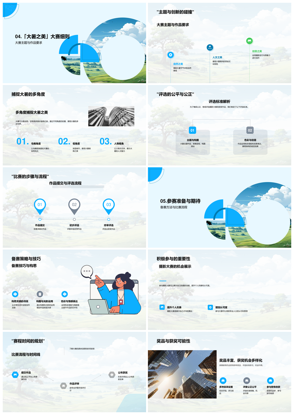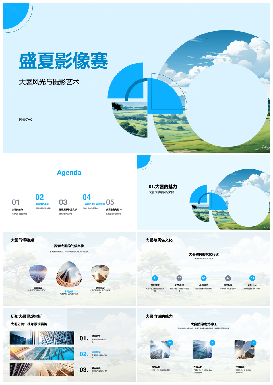 风云办公提供的大暑民俗光影盛夏摄影艺术赛PPT模板,下载格式为pptx,一共28页,作品中文字及图均可以修改和编辑,图片更改请在作品中右键图片并更换,文字修改请直接点击文字进行修改。