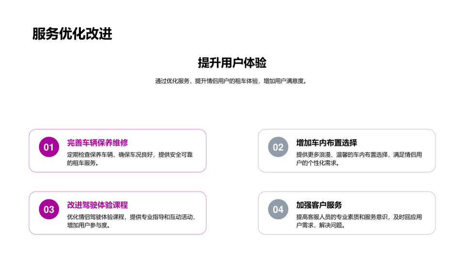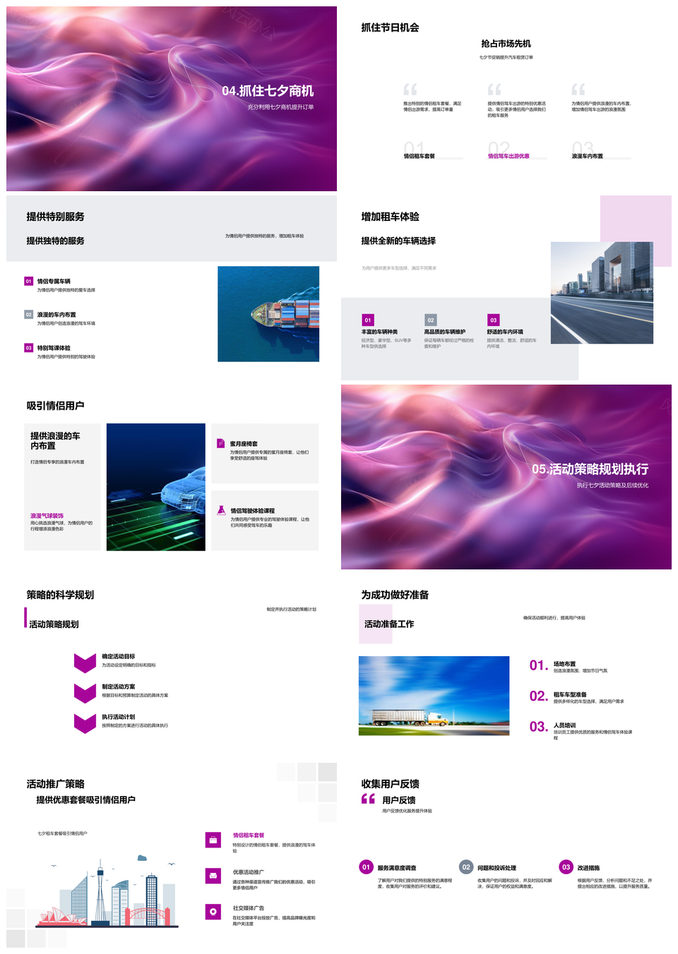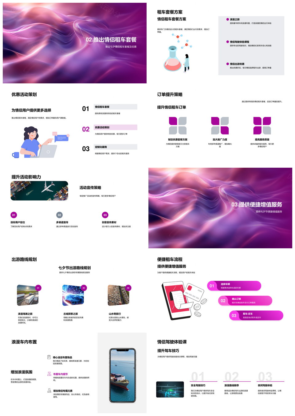 这是一张七夕汽车租赁情侣套餐优惠活动及订单提升策略分析PPT模板,包含七夕、汽车租赁、情侣套餐、优惠活动、订单、提升、策略、分析等主题内容,也可用作七夕汽车租赁情侣套餐优惠活动、汽车租赁情侣套餐优惠活动订单、情侣套餐优惠活动订单提升策略、优惠活动订单提升策略分析、七夕汽车租赁优惠活动订单、汽车租赁情侣套餐订单提升、情侣套餐优惠活动策略分析、七夕优惠活动订单提升策略、汽车租赁订单提升策略分析、七夕情侣套餐优惠活动、优惠活动订单提升策略、七夕汽车租赁情侣套餐、汽车租赁情侣套餐优惠、七夕情侣套餐订单、优惠活动策略分析等PPT场景使用。 风云办公提供的七夕汽车租赁情侣套餐优惠活动及订单提升策略分析PPT模板,下载格式为pptx,一共29页,作品中文字及图均可以修改和编辑,图片更改请在作品中右键图片并更换,文字修改请直接点击文字进行修改。