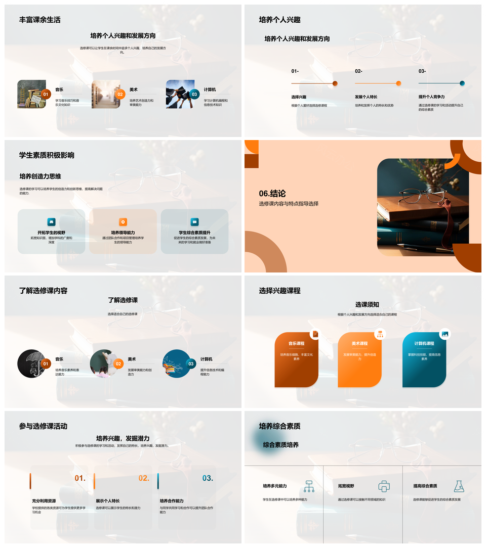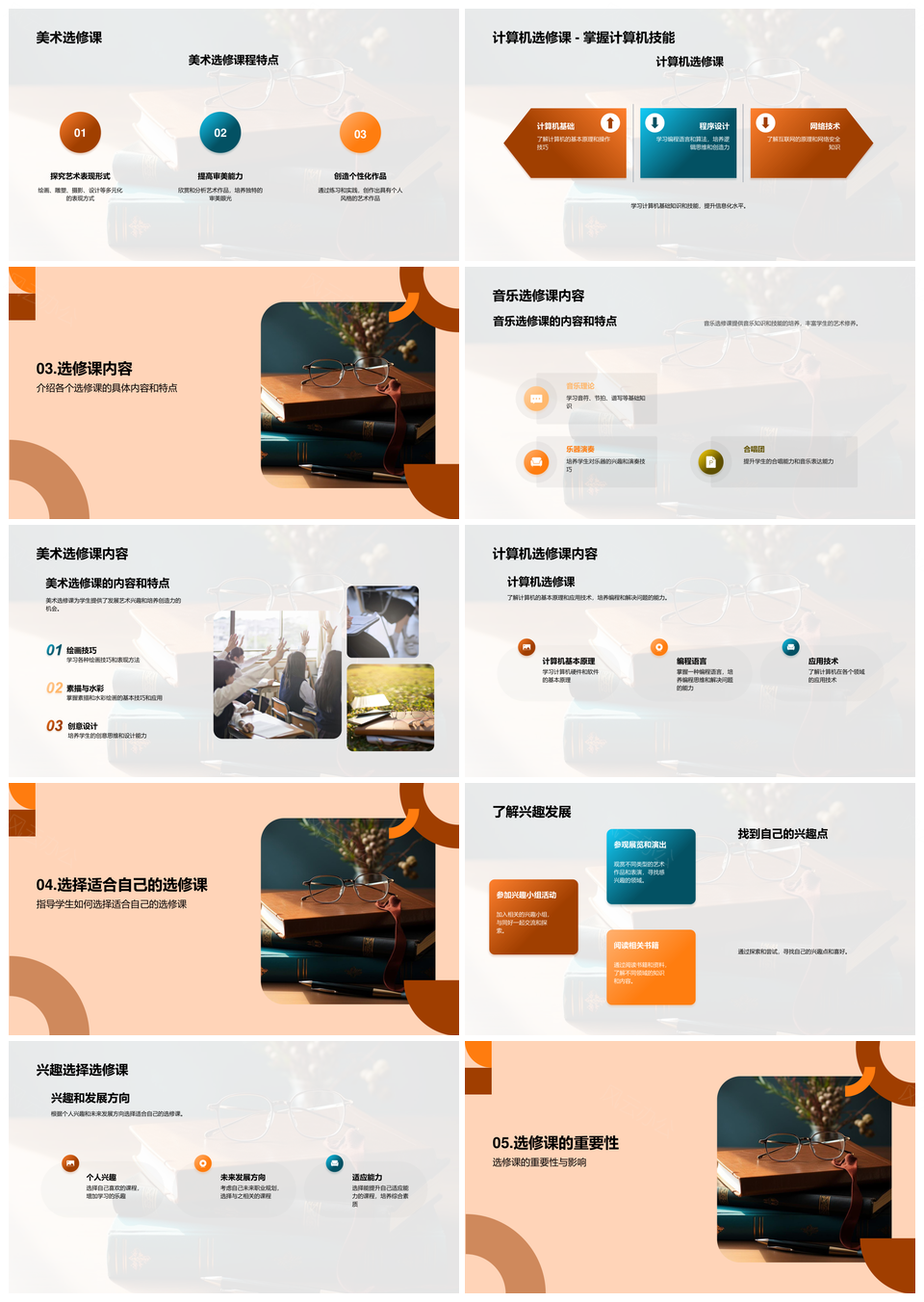 风云办公提供的选修课音美计书籍助兴趣发展PPT模板,下载格式为pptx,一共26页,作品中文字及图均可以修改和编辑,图片更改请在作品中右键图片并更换,文字修改请直接点击文字进行修改。