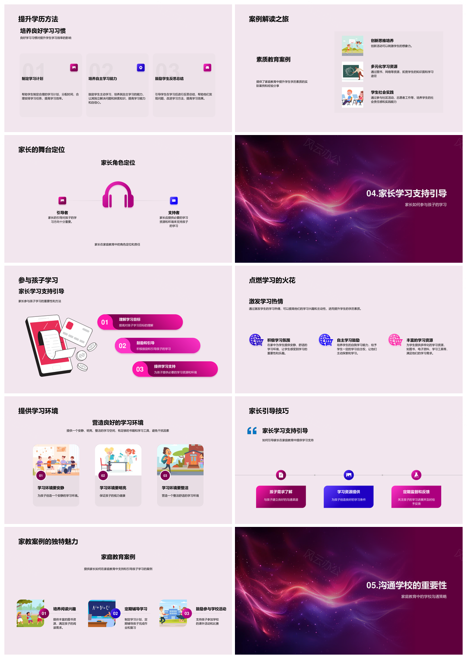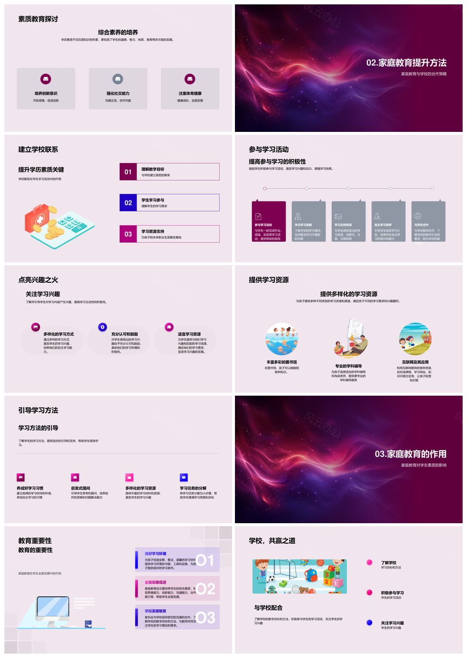 风云办公提供的家校共育提升学历素质助力职业发展PPT模板,下载格式为pptx,一共33页,作品中文字及图均可以修改和编辑,图片更改请在作品中右键图片并更换,文字修改请直接点击文字进行修改。
