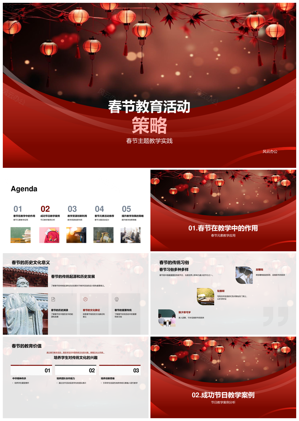 风云办公提供的春节灯笼传统习俗教育实践策略PPT模板,下载格式为pptx,一共24页,作品中文字及图均可以修改和编辑,图片更改请在作品中右键图片并更换,文字修改请直接点击文字进行修改。