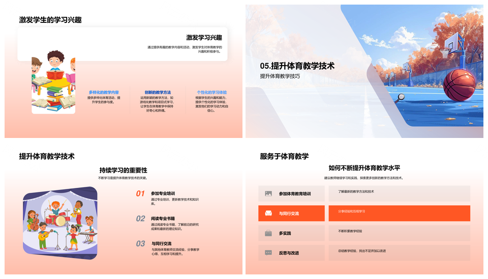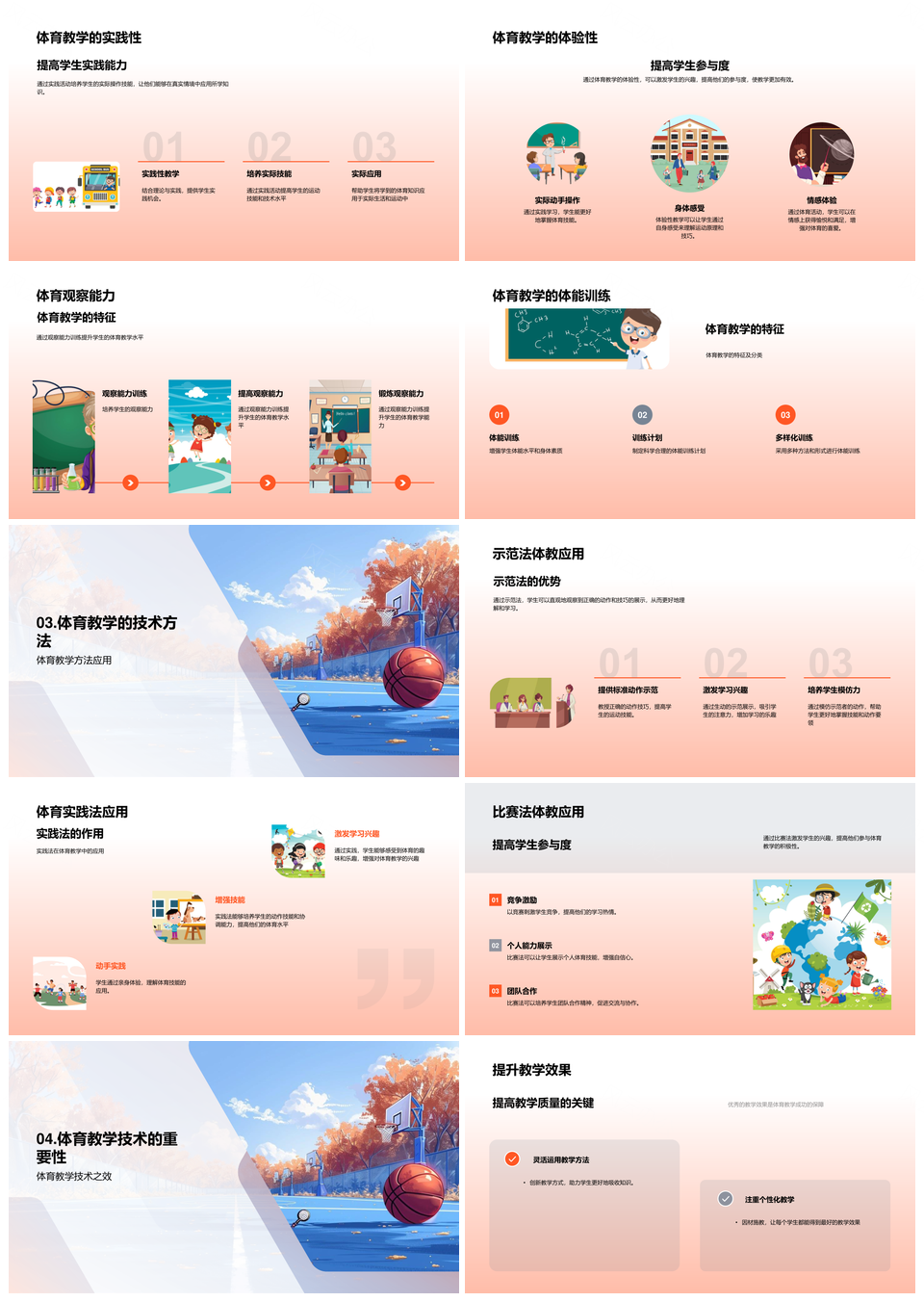 这是一张体育教学技术提升实践体验观察体能训练PPT模板,包含体育教学、技术提升、实践体验、观察、体能训练等主题内容,也可用作体育教学技术提升、教学技术提升实践、技术提升实践体验、提升实践体验观察、实践体验观察体能、体验观察体能训练、体育教学技术、教学技术提升、技术提升实践、提升实践体验、实践体验观察、体验观察体能、观察体能训练、体育教学、教学技术、技术提升等PPT场景使用。 风云办公提供的体育教学技术提升实践体验观察体能训练PPT模板,下载格式为pptx,一共22页,作品中文字及图均可以修改和编辑,图片更改请在作品中右键图片并更换,文字修改请直接点击文字进行修改。