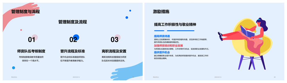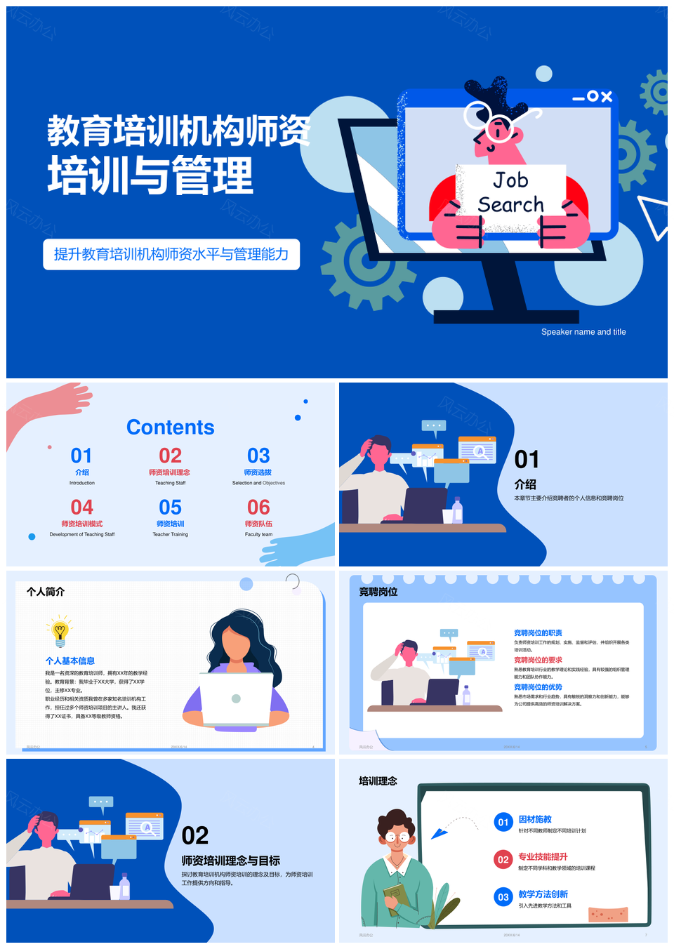 风云办公提供的蓝色插画风教育机构师资培训管理PPT模板,下载格式为pptx,一共20页,作品中文字及图均可以修改和编辑,图片更改请在作品中右键图片并更换,文字修改请直接点击文字进行修改。