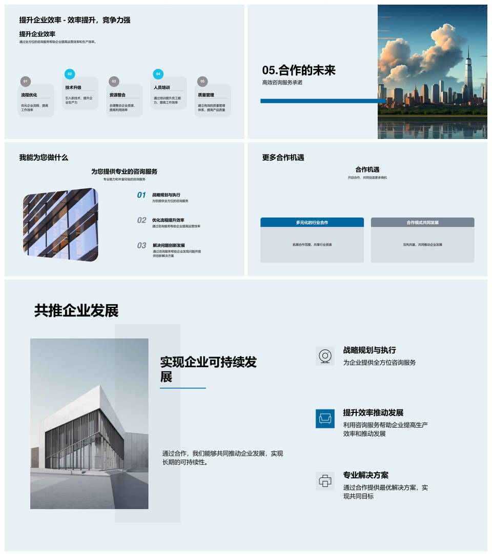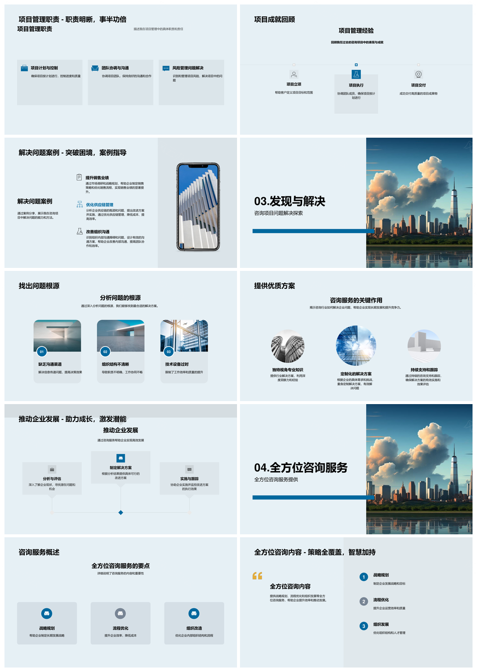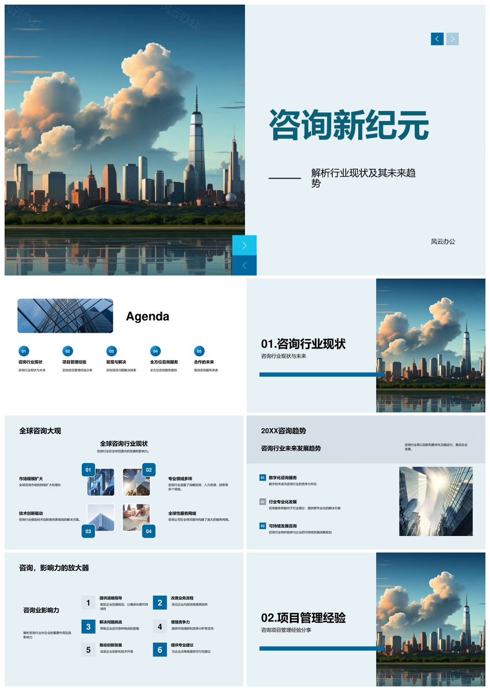 风云办公提供的咨询新纪元全方位方案助企业高效擎天PPT模板,下载格式为pptx,一共23页,作品中文字及图均可以修改和编辑,图片更改请在作品中右键图片并更换,文字修改请直接点击文字进行修改。