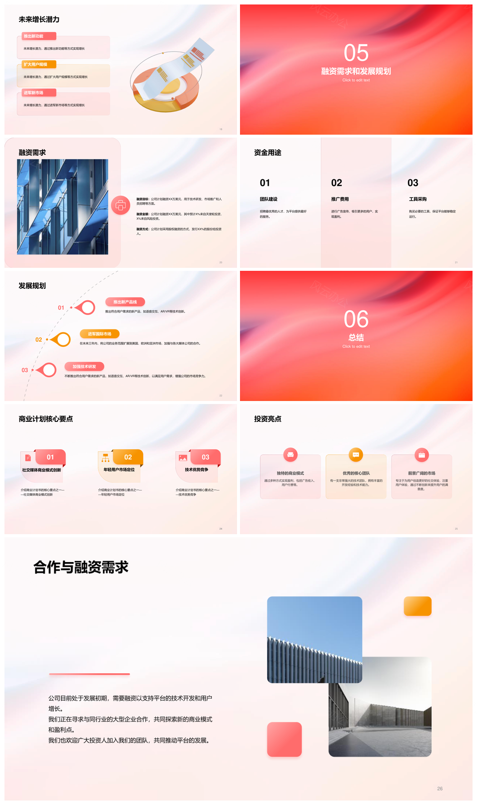 这是一张红紫橙创意渐变社交平台CTR商业计划PPT模板,包含红紫橙、创意、渐变、社交平台、CTR、商业计划等主题内容,也可用作红紫橙创意渐变社交平台、创意渐变社交平台CTR、渐变社交平台CTR商业计划、红紫橙创意渐变、创意渐变社交平台、渐变社交平台CTR、社交平台CTR商业计划、红紫橙创意、创意渐变、渐变社交平台、社交平台CTR、CTR商业计划、红紫橙社交平台、红紫橙商业计划、创意商业计划等PPT场景使用。 风云办公提供的红紫橙创意渐变社交平台CTR商业计划PPT模板,下载格式为pptx,一共27页,作品中文字及图均可以修改和编辑,图片更改请在作品中右键图片并更换,文字修改请直接点击文字进行修改。