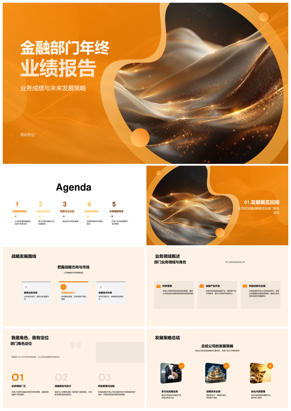 风云办公提供的金融部门年终业务成绩与战略发展报告PPT模板,下载格式为pptx,一共33页,作品中文字及图均可以修改和编辑,图片更改请在作品中右键图片并更换,文字修改请直接点击文字进行修改。